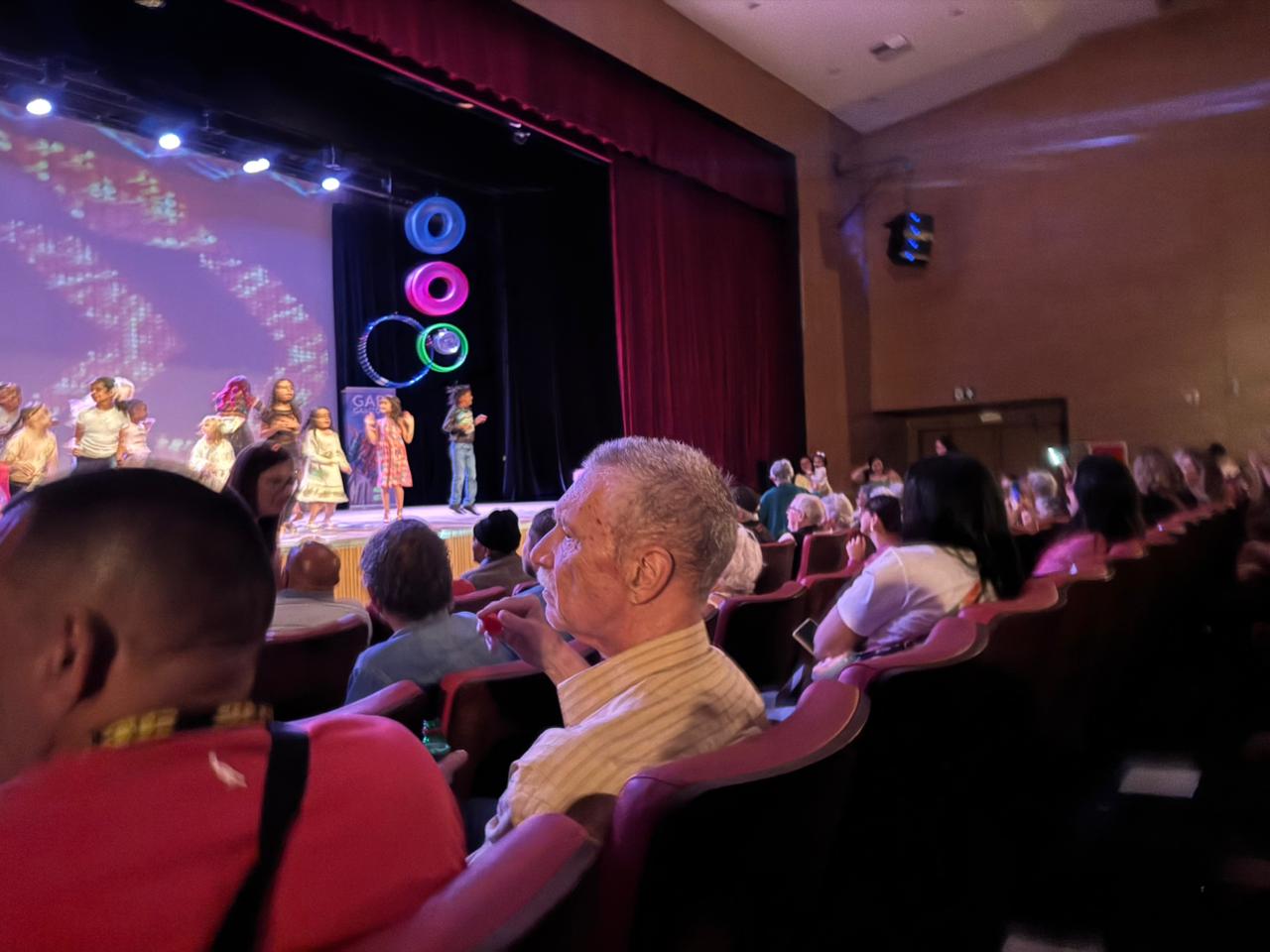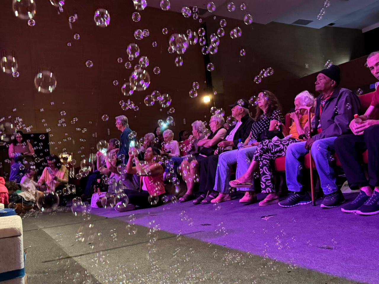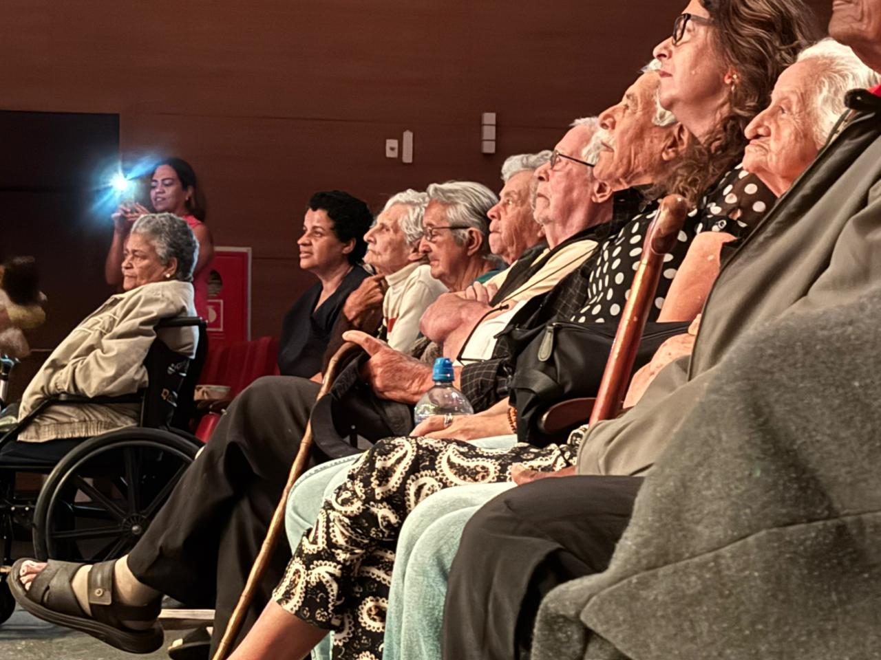 Idosos assistiram à peça ‘As Aventuras do Bambolê do Tempo’, de Gabi Gabizoca, no Teatro Maestro Franklin de Carvalho Júnior