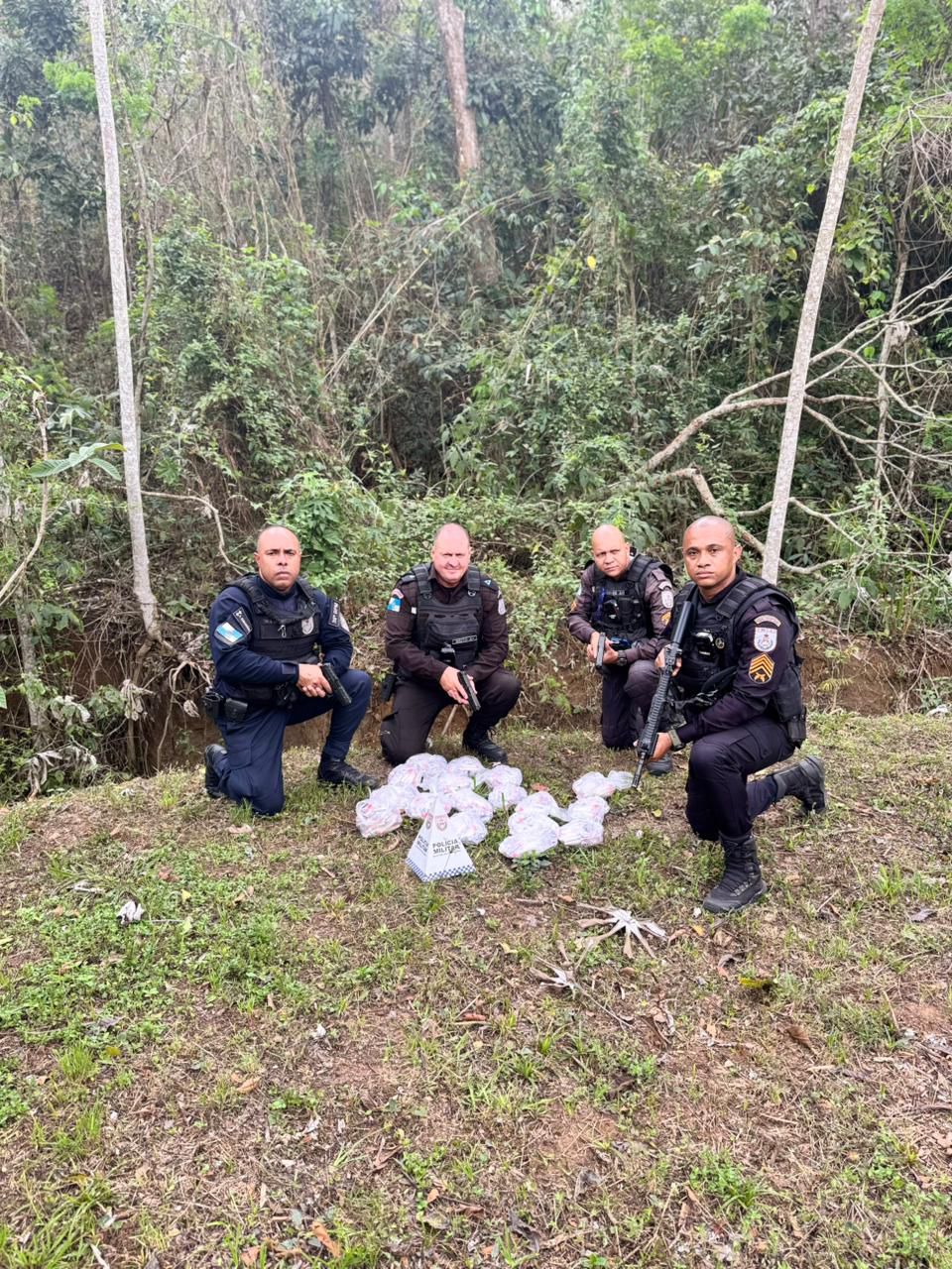 Durante buscas intensas na mata fechada, os policiais encontraram 17 cargas contendo 677 pinos de cocaína, identificados com a inscrição “TOMA JACK TRÊS RIOS CV PÓ DE 30”. O material foi apresentado na 107ª Delegacia de Polícia (DP), onde ficou apreendido. De acordo com os policiais envolvidos na ação, o prejuízo estimado ao tráfico local é de aproximadamente R$ 20 mil. Ninguém foi preso.
