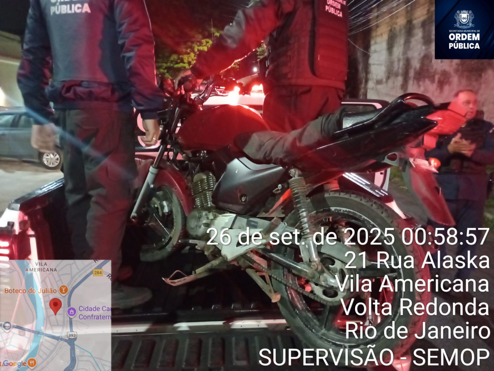O Sistema Integrado de Segurança Pública de Volta Redonda, serviço da Secretaria Municipal de Ordem Pública (Semop), registrou mais uma ação preventiva na madrugada desta sexta-feira, dia 26, que resultou na apreensão de uma motocicleta irregular e na condução de um adolescente, de 15 anos, à delegacia por porte de droga.