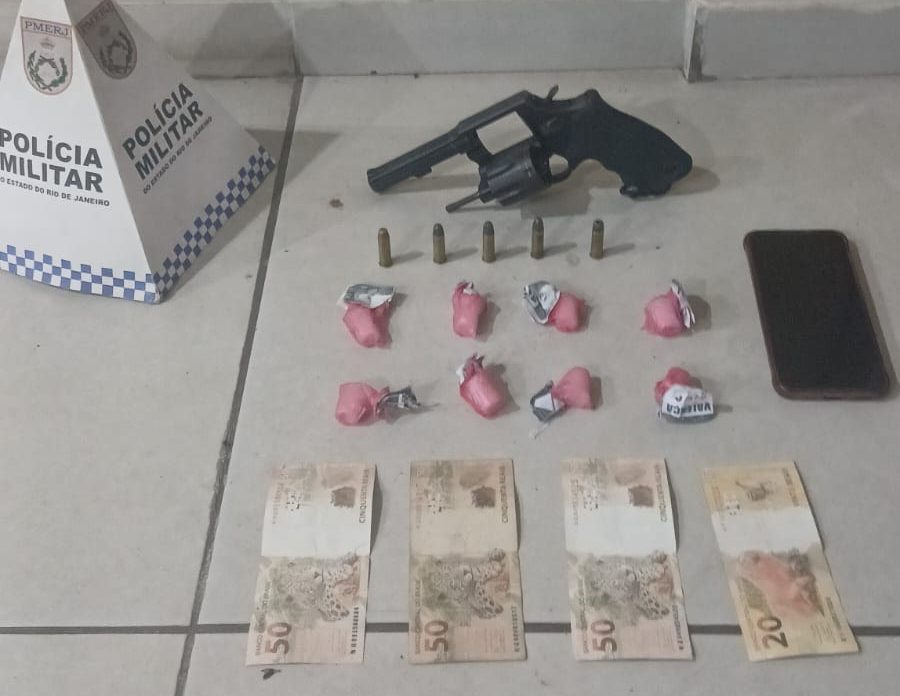 Segundo a Polícia Militar, o suspeito tentou fugir ao perceber a aproximação das guarnições e arremessou um revólver calibre 38 com numeração suprimida. Com ele, foram apreendidas cinco munições intactas, oito pinos de cocaína — que totalizaram 13 gramas após perícia —, R$ 170 em dinheiro e um celular.