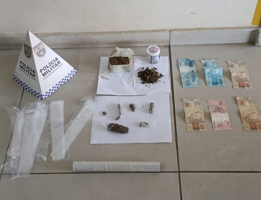 Durante as buscas no quarto utilizado pelo adolescente, os policiais encontraram um tablete prensado de maconha, seis tiras da droga já embaladas para comercialização, um recipiente contendo maconha, além de grande quantidade de material para endolação. Também foram apreendidos R$ 360 em dinheiro.