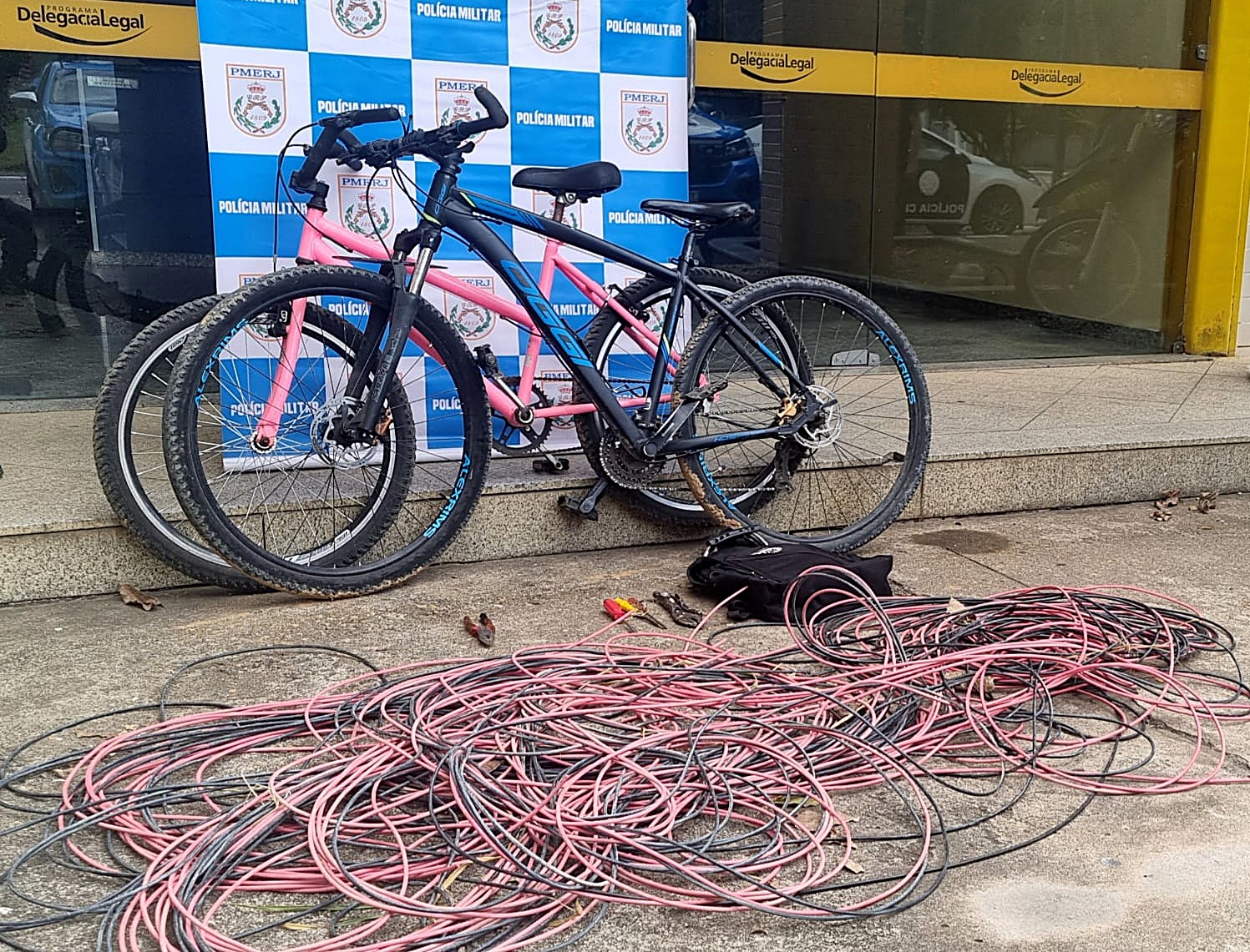 Durante patrulhamento na Rua André Luiz, os policiais avistaram um jovem com uma mochila preta. Ao perceber a aproximação da viatura, ele tentou se esconder atrás de uma árvore. Na abordagem, os agentes encontraram dentro da mochila alicates, chave de fenda. Fios cortados, duas bicicletas e dois celulares também foram apreendidos.