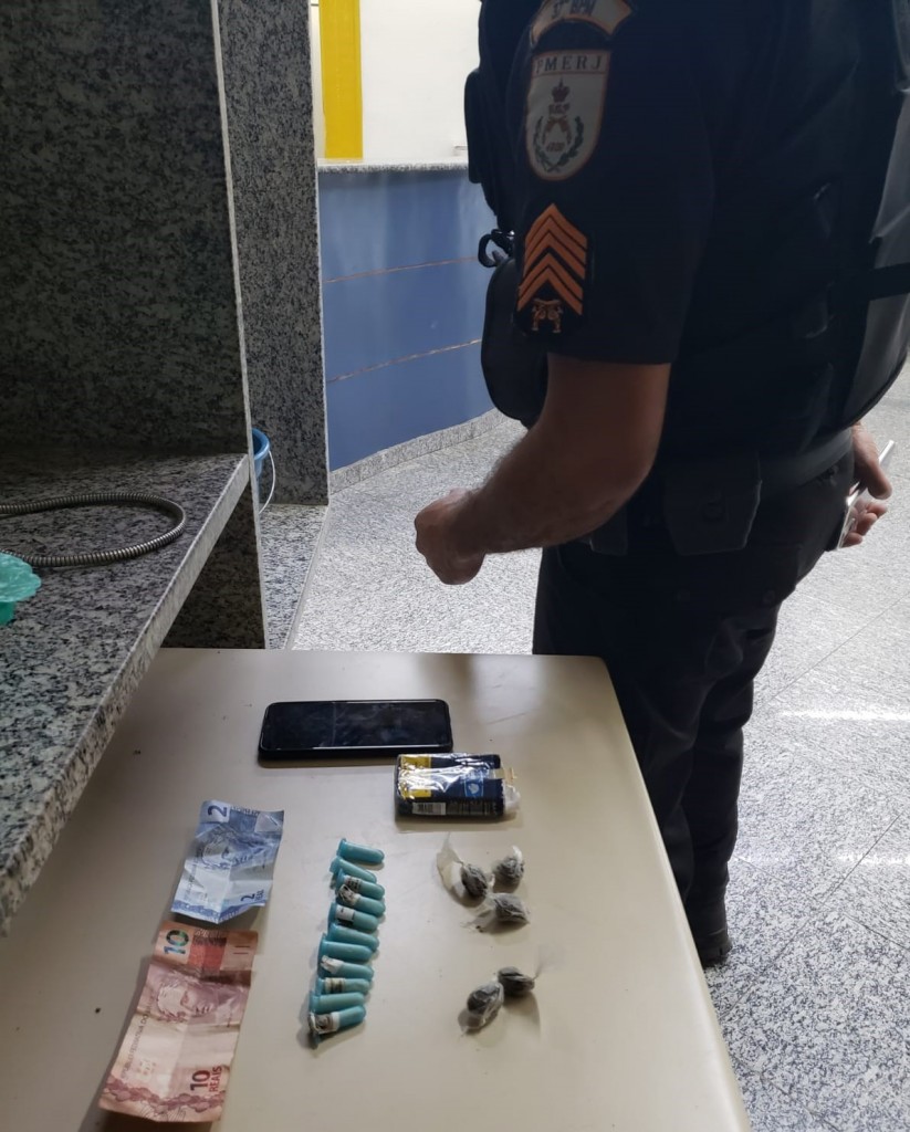Os policiais faziam segurança na Festança Rural, realizada na Feira da Roça, na Avenida Euclides Alves Guimarães Cotia, quando receberam a denúncia de um pedestre dando conta de que um jovem, usando blusa e bermuda de cor preta estaria vendendo drogas próximo ao banheiro fixo do local. Quando os militares se aproximaram do local, avistaram o suspeito, que tentou fugir no meio da multidão. Ele foi detido e em revista, os policiais encontraram no bolso de sua bermuda12 pinos de cocaína, cinco trouxinhas de maconha e a quantia em dinheiro de R$12.