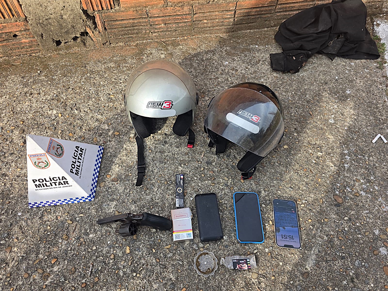 No local, foram apreendidos um revólver calibre 38 desmuniciado, dois celulares, dois capacetes, um triturador de maconha e um invólucro de maconha. As motos utilizadas na fuga- uma Honda CB Twister vermelha e uma Honda XRE cinza- também foram recolhidas e apresentadas na 89ª Delegacia de Polícia (DP).