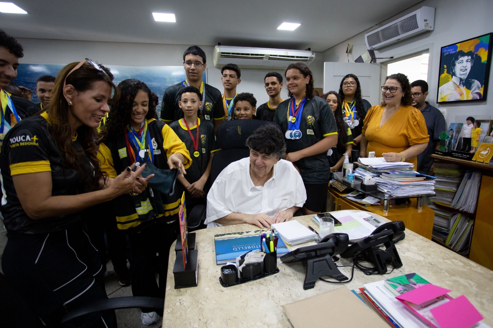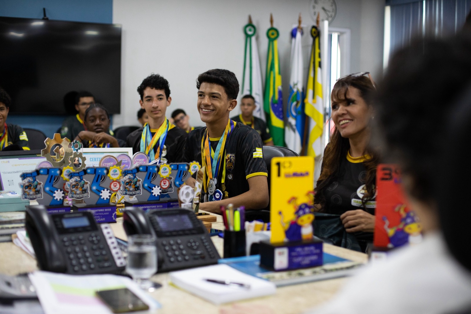 Os estudantes visitaram o gabinete do prefeito Antonio Francisco Neto nessa quinta-feira (4), apresentando seus projetos, medalhas e troféus, que simbolizam o empenho e a dedicação do grupo. Eles estiveram acompanhados da diretora Cláudia Teixeira e da professora e técnica da equipe, Elaine Fialho, responsáveis por incentivar e orientar o trabalho inovador realizado pelos jovens.