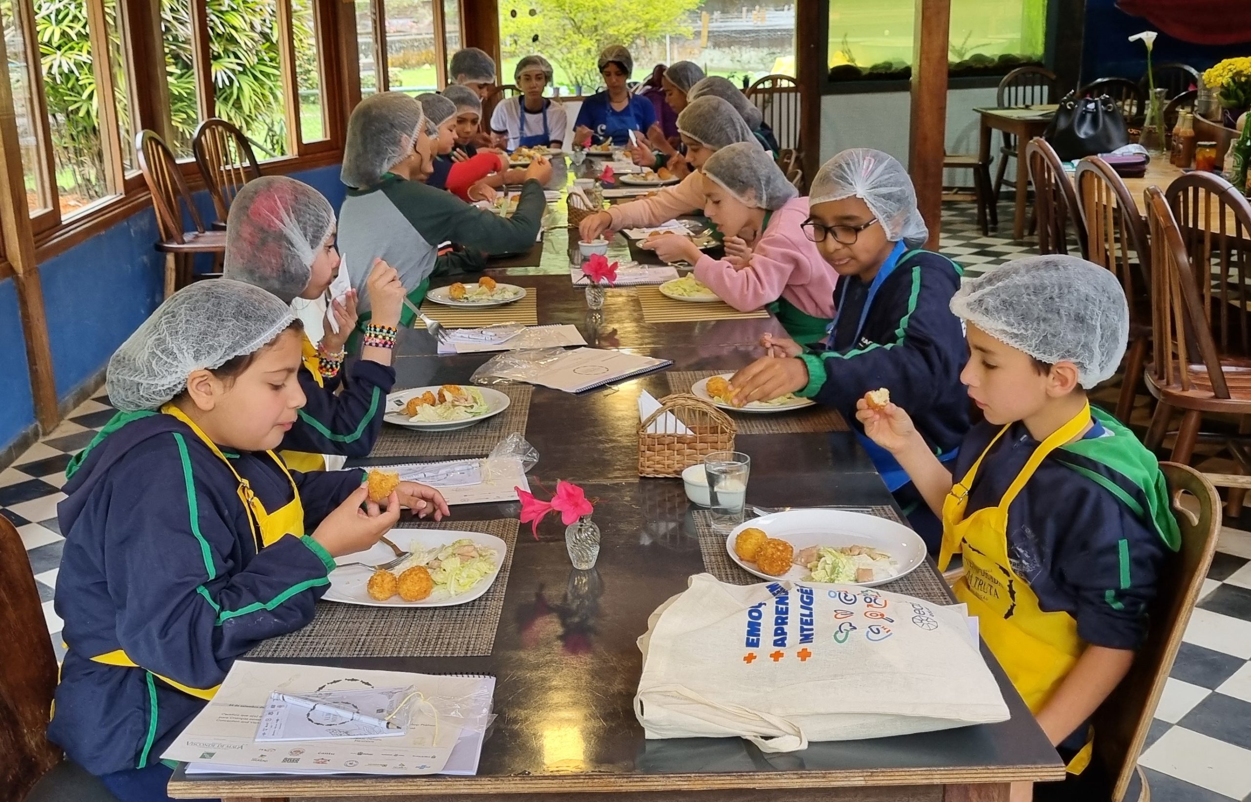 A atividade começou com a visita aos tanques do restaurante e seguiu para a cozinha, onde os alunos aprenderam a preparar receitas tradicionais e criativas: bolinho de truta, salada caesar com isca de truta e risoto de truta.