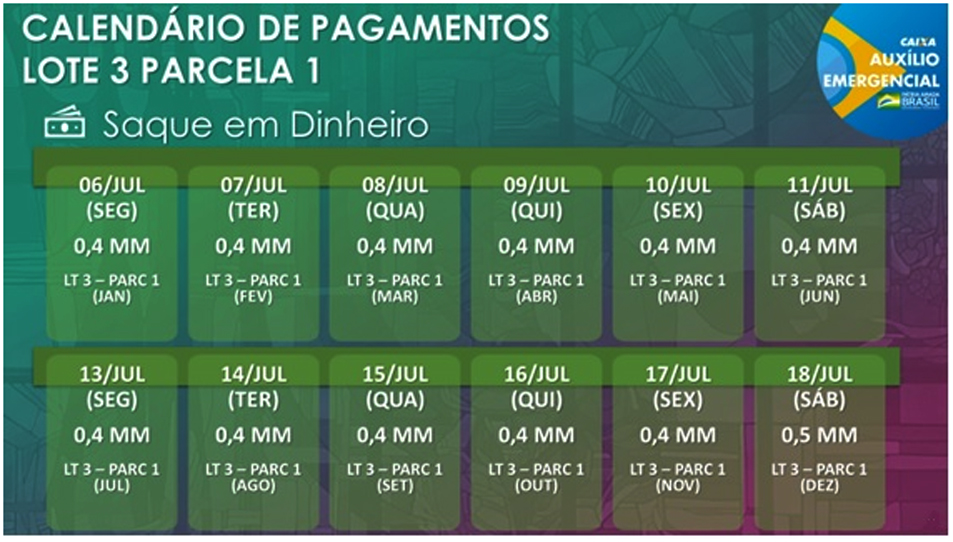 O cronograma estipulado pelo Ministério da Cidadania tem como proposta aprimorar o pagamento e evitar congestionamento nos meios digitais e as aglomerações nos pontos de atendimento. Nesta etapa de pagamentos da primeira parcela do Auxílio Emergencial, os beneficiários nascidos de janeiro a junho poderão movimentar digitalmente os valores pelo aplicativo CAIXA Tem a partir desta terça-feira, 16. E os nascidos de julho a dezembro, a partir da quarta-feira, 17.