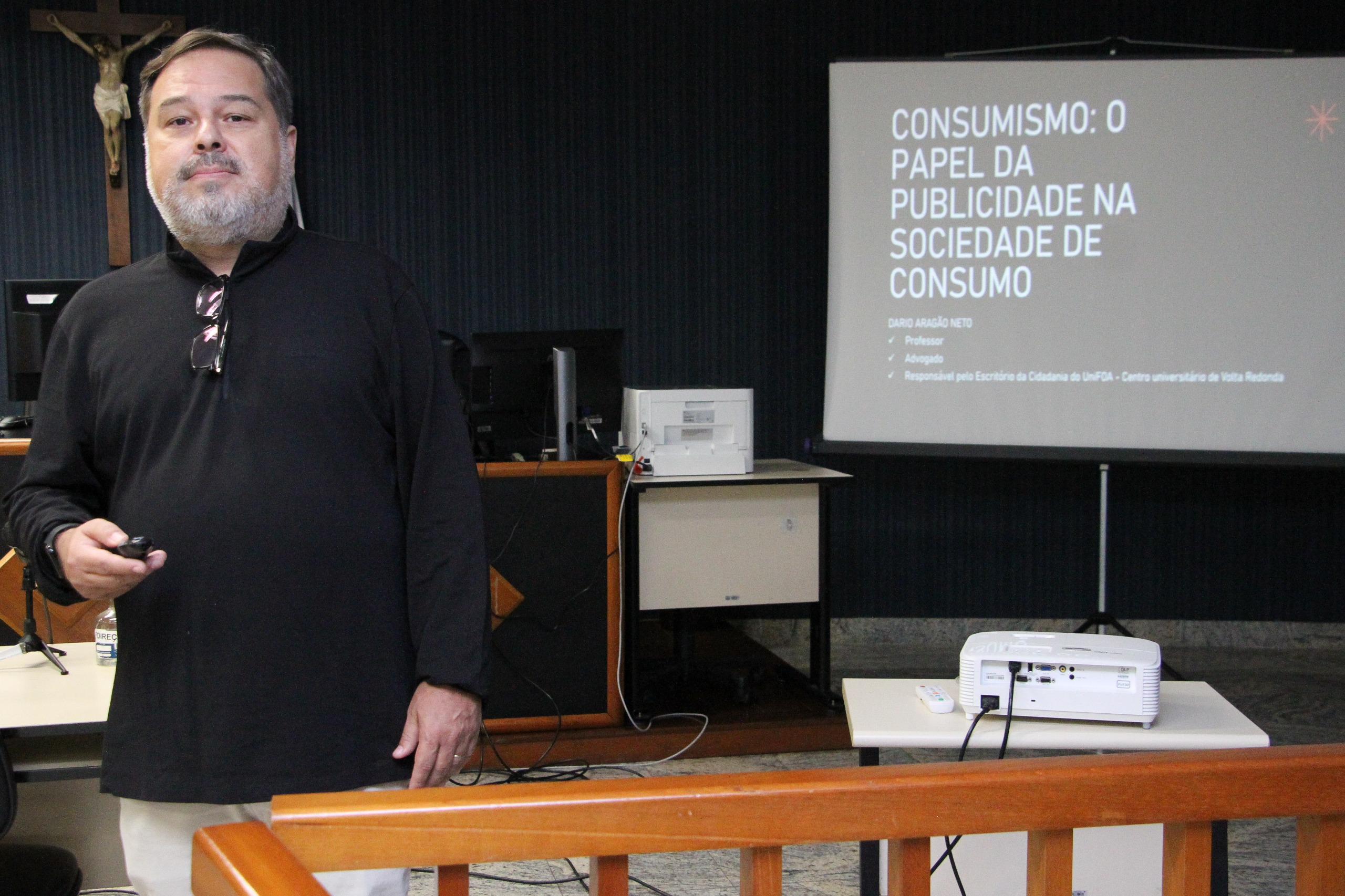 Durante a palestra de abertura, o professor Dario Aragão Neto abordou o conceito de ‘hiperconsumismo’ na sociedade contemporânea e os impactos da publicidade nas decisões de compra. “A nossa sociedade hoje é baseada em toda relação de consumo. Por mais que a gente tente escapar dessa engrenagem, é praticamente impossível. Vivemos talvez não mais uma sociedade de consumo, mas uma sociedade de hiperconsumo”, afirmou.