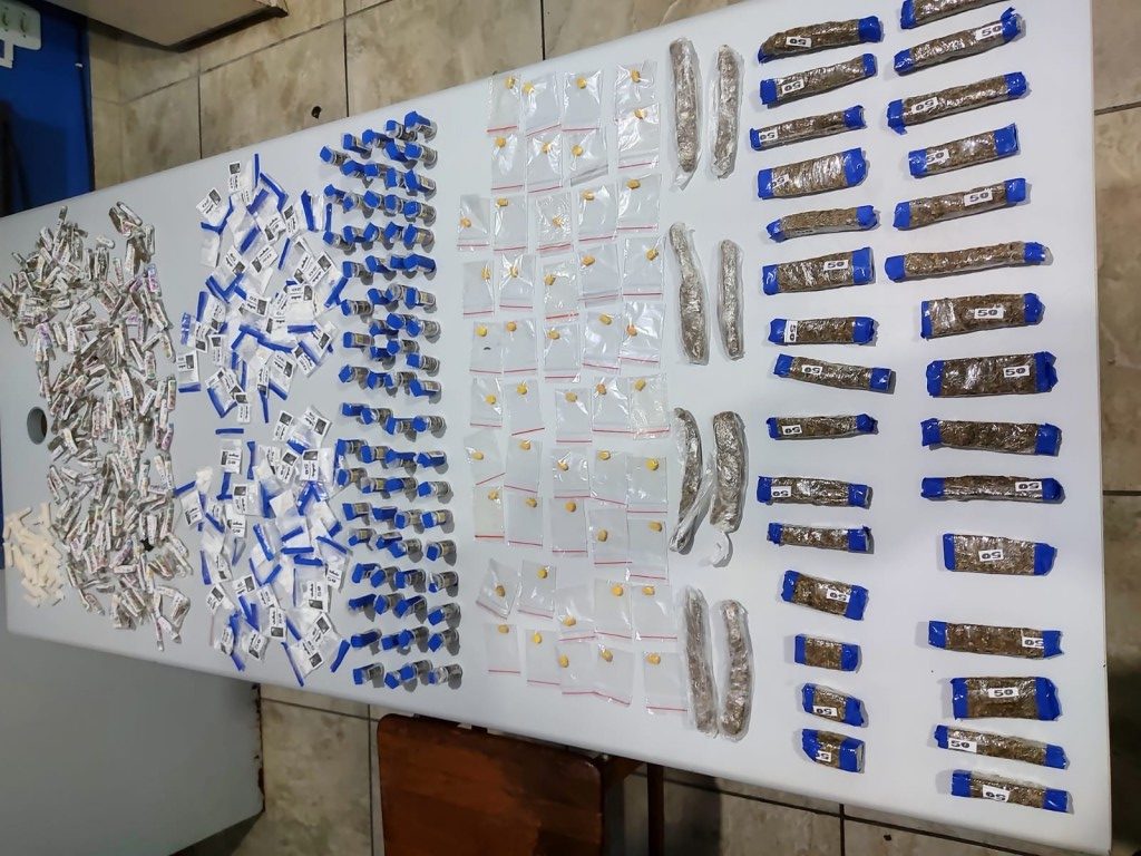 No total foram apreendidos 50 comprimidos de ecstasy, 120 pinos de cocaína e 373 barras de maconha.