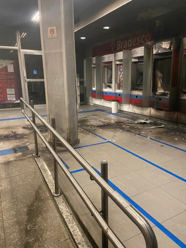 Caixas eletrônicos de uma agência bancária foram incendiados na madrugada desta sexta-feira, dia 17, no bairro Campos Elíseos, principal Centro Comercial da cidade. Segundo a Polícia Militar, os suspeitos de atearem fogo são dois homens, ainda não identificados, que foram flagrados pelas câmeras de segurança do banco. Até o fechamento desta reportagem nenhum suspeito havia sido preso.
