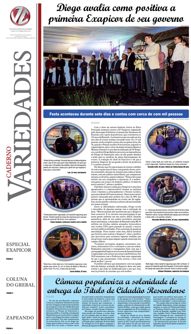 No ano em que Resende comemora 216 anos, a Câmara de Vereadores decidiu inovar e integrou a tradicional cerimônia de entrega do Título de Cidadão Resende à Exapicor. Pela primeira vez, a solenidade aconteceu no Parque de Exposições e aberta ao público. A medida, tomada pela Mesa Diretora, teve como objetivo reduzir gastos com aluguel de espaço e popularizar a cerimônia.“Foi uma comemoração de portas abertas. Em vez de alugar um espaço para receber o evento, como vinha sendo feito até então, a Câmara optou por aproveitar a estrutura montada para as festividades da Exapicor e fazer uma comemoração aberta ao público”, e o número de pessoas que compareceram a solenidade comprovou o sucesso da medida que tomamos”, avalio o presidente da Câmara, vereador Roque Cerqueira.
