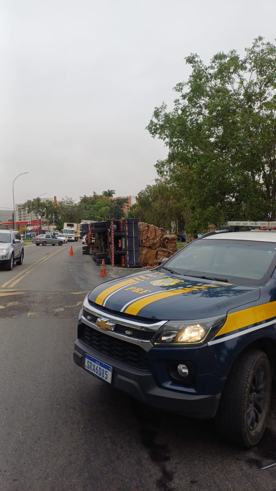 A Polícia Rodoviária Federal (PRF) informou que um caminhão carregado com papelão reciclável tombou na noite de ontem, 23, por volta das 23 horas, no km 281 da BR-393, na altura do acesso aos bairros Dom Bosco (VR) e São Luiz, em Barra do Piraí.
