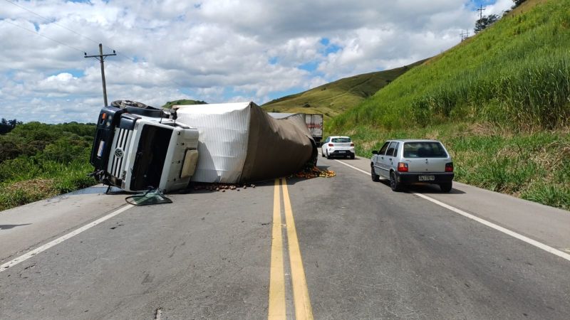 Um caminhão carregado com tomates tombou na manhã desta terça-feira, 24, na BR-393, em Três Rios.