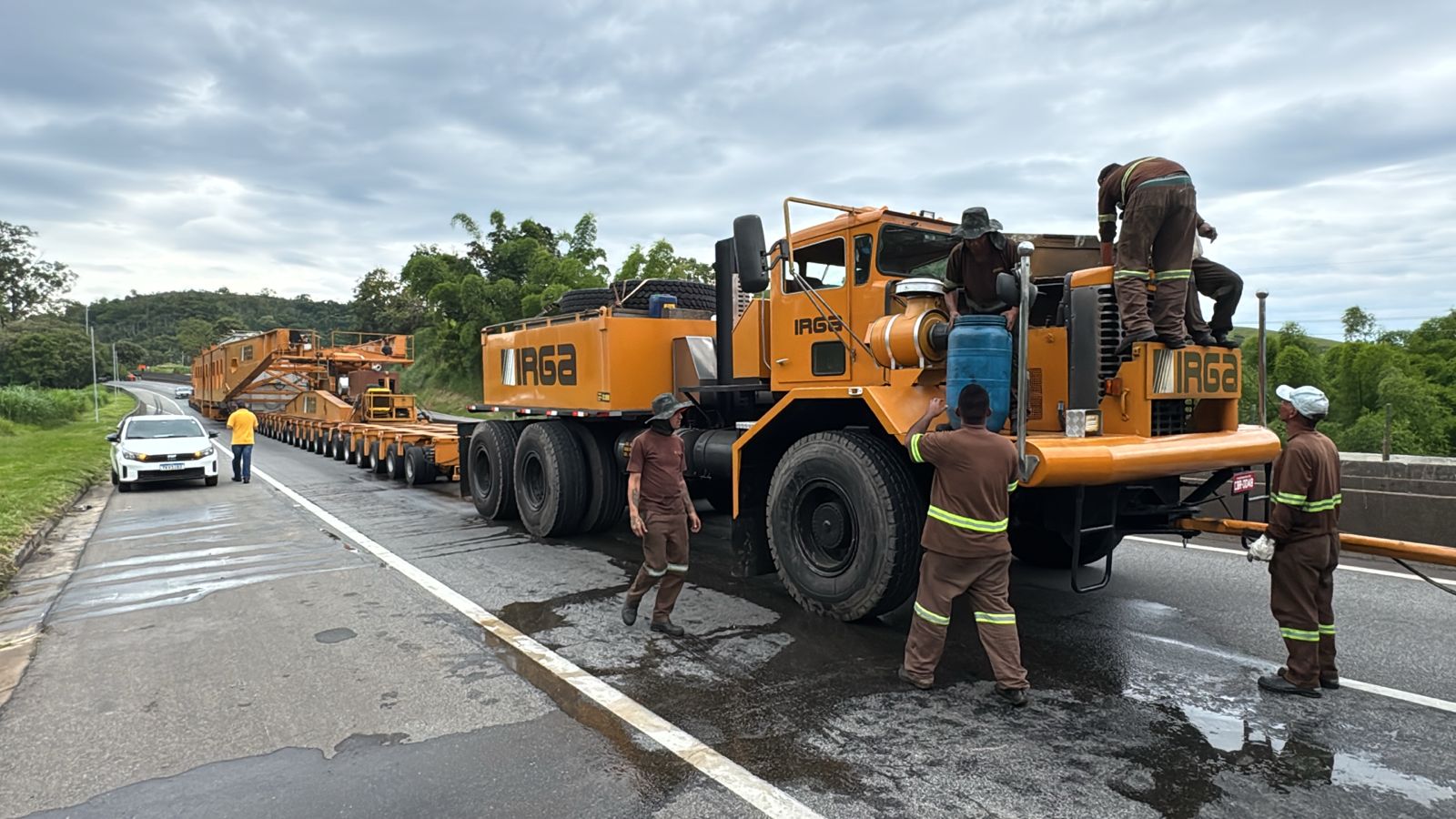 O conjunto transporta um transformador com peso aproximado de 850 toneladas, que segue em direção ao Porto de Itaguaí, na Região Metropolitana do Rio de Janeiro. A operação envolve logística especial, escolta e controle de tráfego ao longo do percurso.