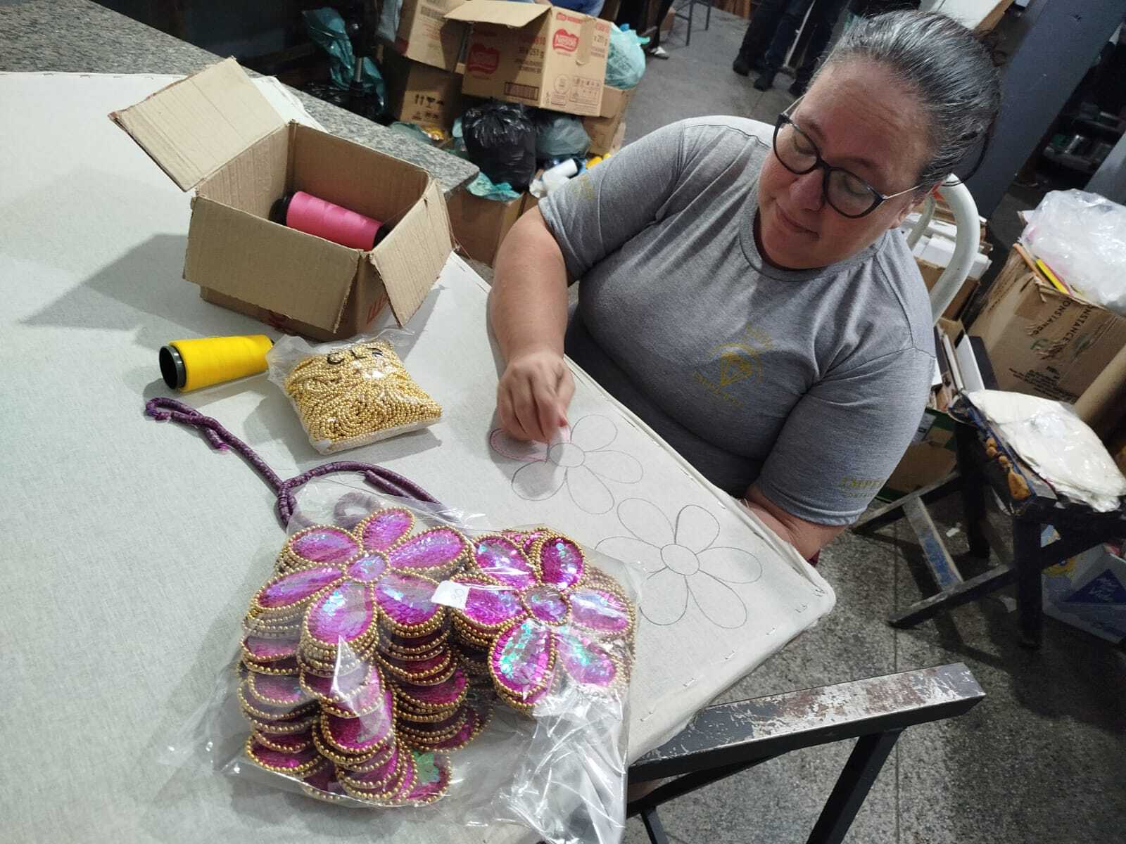 “Temos uma equipe grande de bordadeiras e entendemos que é muito importante valorizar esse trabalho da indústria do carnaval, onde culturalmente tudo é artesanal, desde o barracão, a escultura e as ferragens até a parte do brilho, onde entra a mão de obra daqui, com os paetês que elas bordam para a montagem das roupas”, explicou o empresário.
