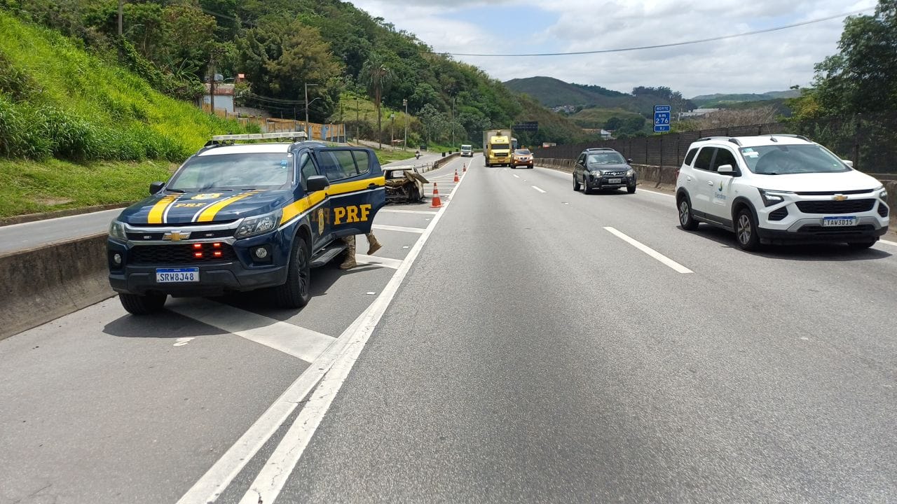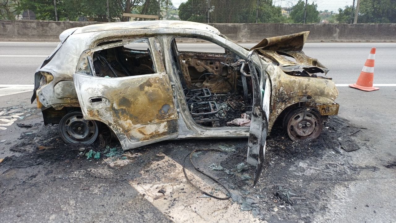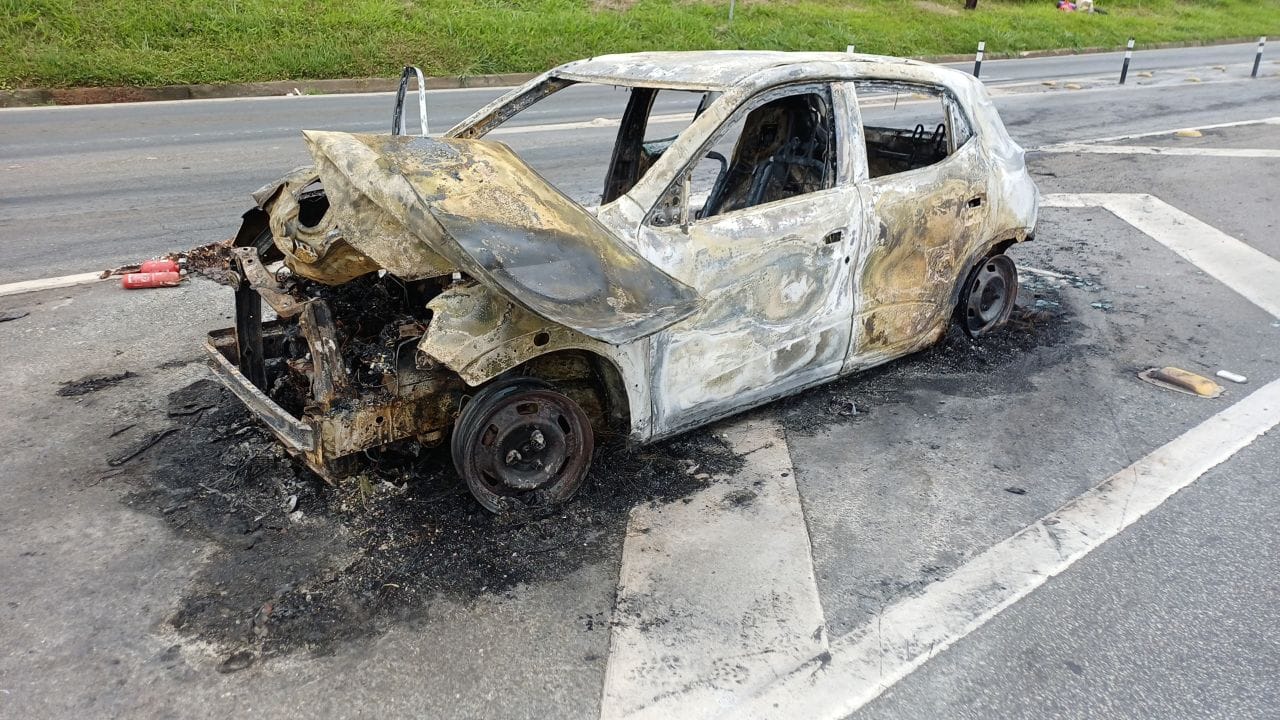 Segundo informações da Polícia Rodoviária Federal (PRF), o veículo, um Renault Kwid, ficou totalmente destruído pelas chamas.