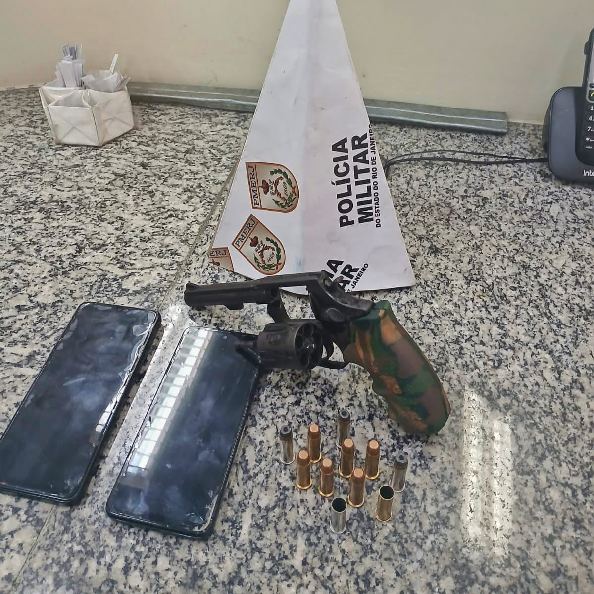 Durante a abordagem, os agentes encontraram com o homem, de 21 anos, quatro munições intactas e duas munições deflagradas calibre 38 em um dos bolsos. Em seguida, ao revistarem a mochila que ele carregava, foi localizado um revólver calibre 38, da marca Taurus, com a numeração suprimida, municiado com cinco munições intactas.