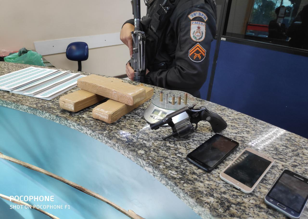 Quando receberam informações de que estaria ocorrendo suposto tráfico de drogas em uma área de mata, os policiais militares foram até o local, fizeram cerco e detiveram cinco pessoas, sendo três menores de 17, 16 e 15 anos. Rodrigo da Silva, 28 anos, e Juan da Costa Ribeiro, 19, estavam no grupo e foram presos. Foram apreendidos um revólver calibre 38 marca Taurus, cinco munições calibre 38 marca CBC, três tabletes de maconha pesando aproximadamente dois quilos, uma balança digital, 2,4 mil etiquetas adesivas com a descrição “Braba de 10,00- qualquer violação reclamar na boca”, além de quatro celulares.
