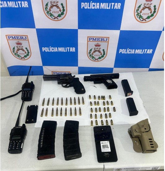 Com eles, foram apreendidos um revólver calibre .38 com seis munições intactas, uma pistola 9mm com dois carregadores e 28 munições, dois rádios transmissores, dois carregadores de fuzil calibre 5.56 com 19 munições, um coldre e um celular.