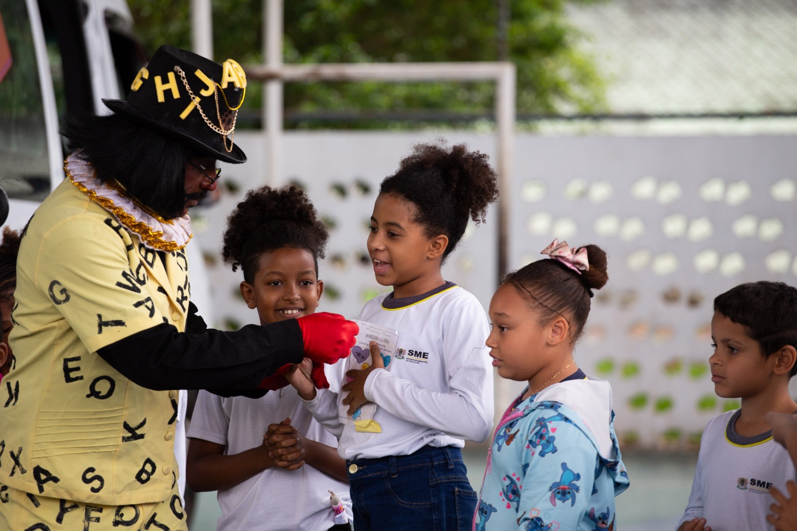 O ‘Senhor das Letras’, personagem de Washington Kellington, recebeu os alunos do 1º ao 4º ano do ensino fundamental e contou a história de ‘João e Maria’. Em seguida, desafiou as crianças, que tinham entre 6 e 10 anos de idade, a contar uma história com final feliz.