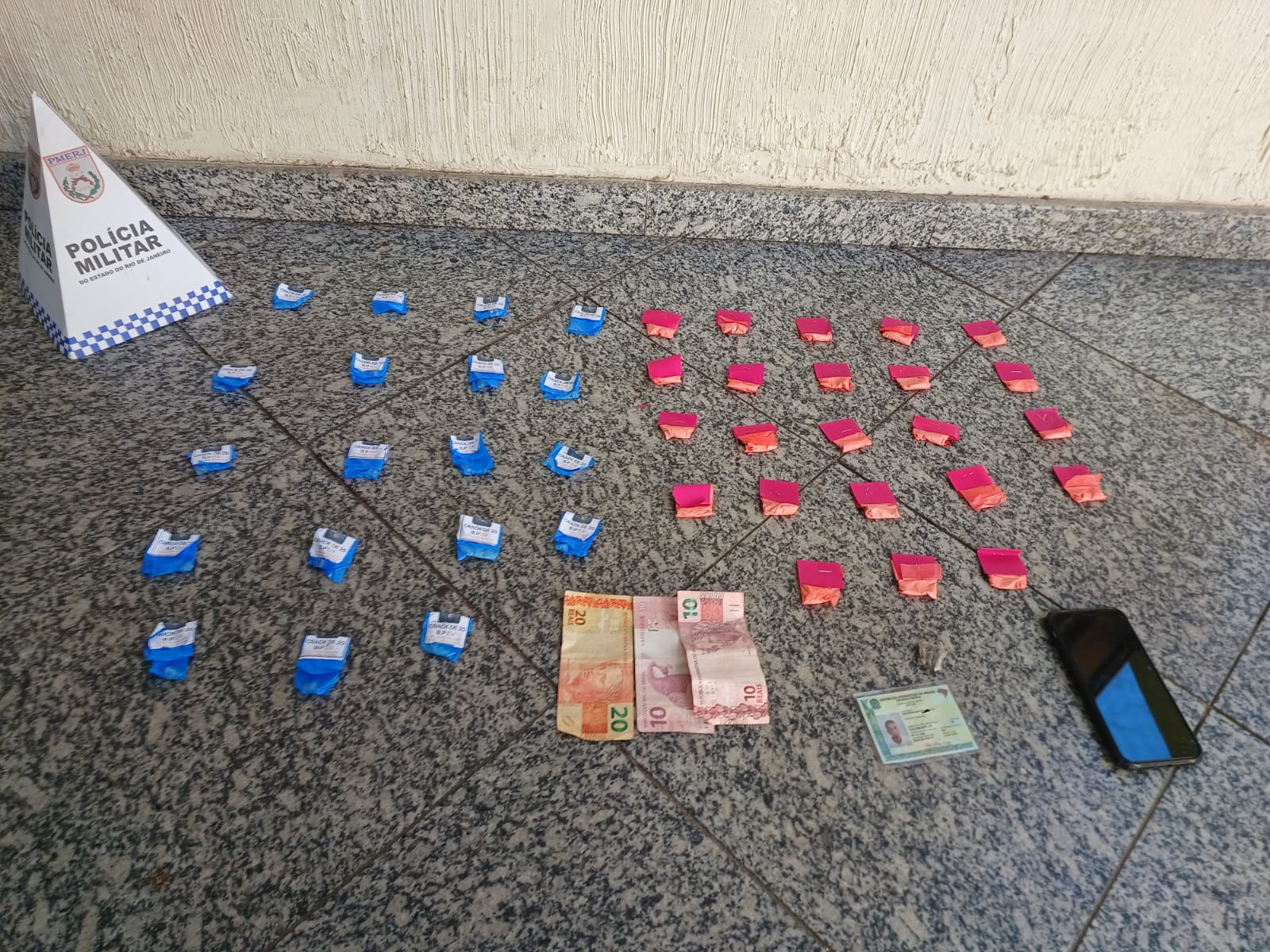 De acordo com o registro policial, o acusado confessou ter arremessado as drogas em outra residência próxima. Após buscas no local indicado, o material foi encontrado próximo a uma janela por um dos policiais. No total, foram apreendidos 19 pedras de crack, 23 papelotes de cocaína, R$ 40 em espécie e um celular iPhone bloqueado.