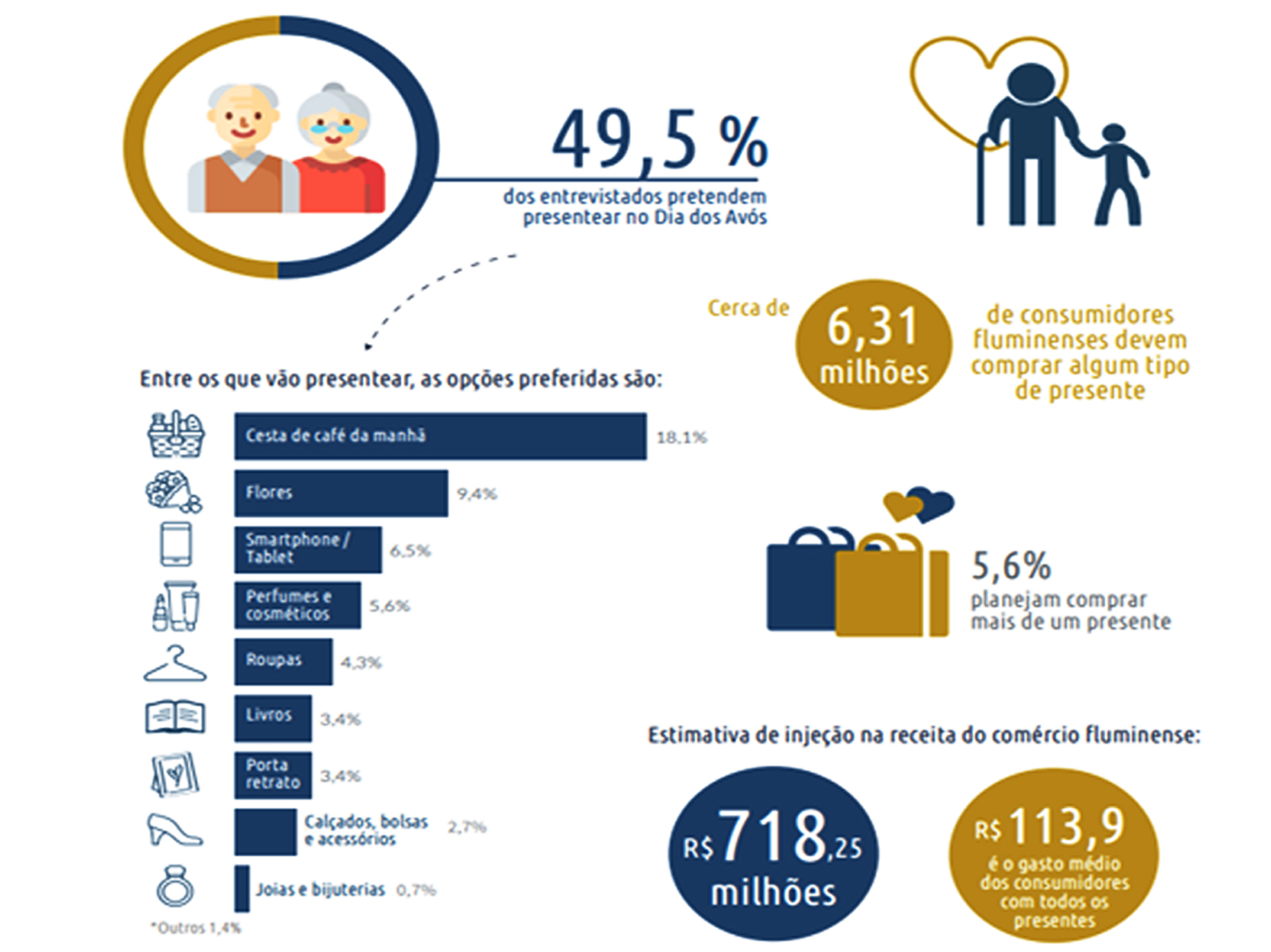 O levantamento mostrou que cerca de 6 milhões de fluminenses devem presentear seus vovôs e vovós, tendo como gasto médio R$ 113,90. Na lista de presentes, a liderança é da cesta de café da manhã (18,1%), seguido por flores (9,4%), smartphones e tablet (6,5%), perfumes e cosméticos (5,6%), roupas (4,3%), livros (3,4%) porta-retratos (3,4%), calçados, bolsas e acessórios (2,7%) e joias e bijuterias (0,7%). A estimativa é que a data movimente aproximadamente R$ 718 milhões na economia do estado.