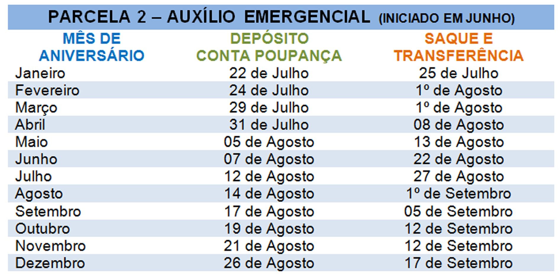 Quem recebeu a primeira parcela em junho ou até 4 de julho receberá o crédito da segunda parcela entre os dias 22 de julho e 26 de agosto. Já os saques e transferências serão liberados entre 25 de julho e 17 de setembro: