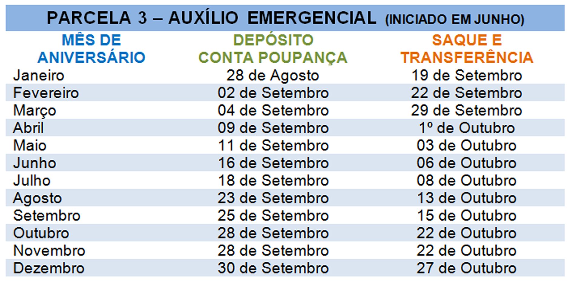 A segunda parcela será depositada em poupança social entre 28 de agosto a 30 de setembro e os saques e transferências serão permitidos entre 19 de setembro e 27 de outubro. A terceira parcela para este grupo de beneficiários terá depósito em poupança social entre 9 de outubro e 19 de novembro e os saques e transferências poderão ocorrer entre 29 de outubro e 19 de novembro.