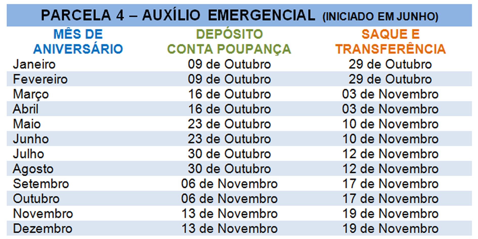A quarta e quinta parcelas estão previstas para ter depósito em poupança social entre 16 e 30 de novembro. Já os saques e transferências ocorrerão entre 26 de novembro e 15 de dezembro.