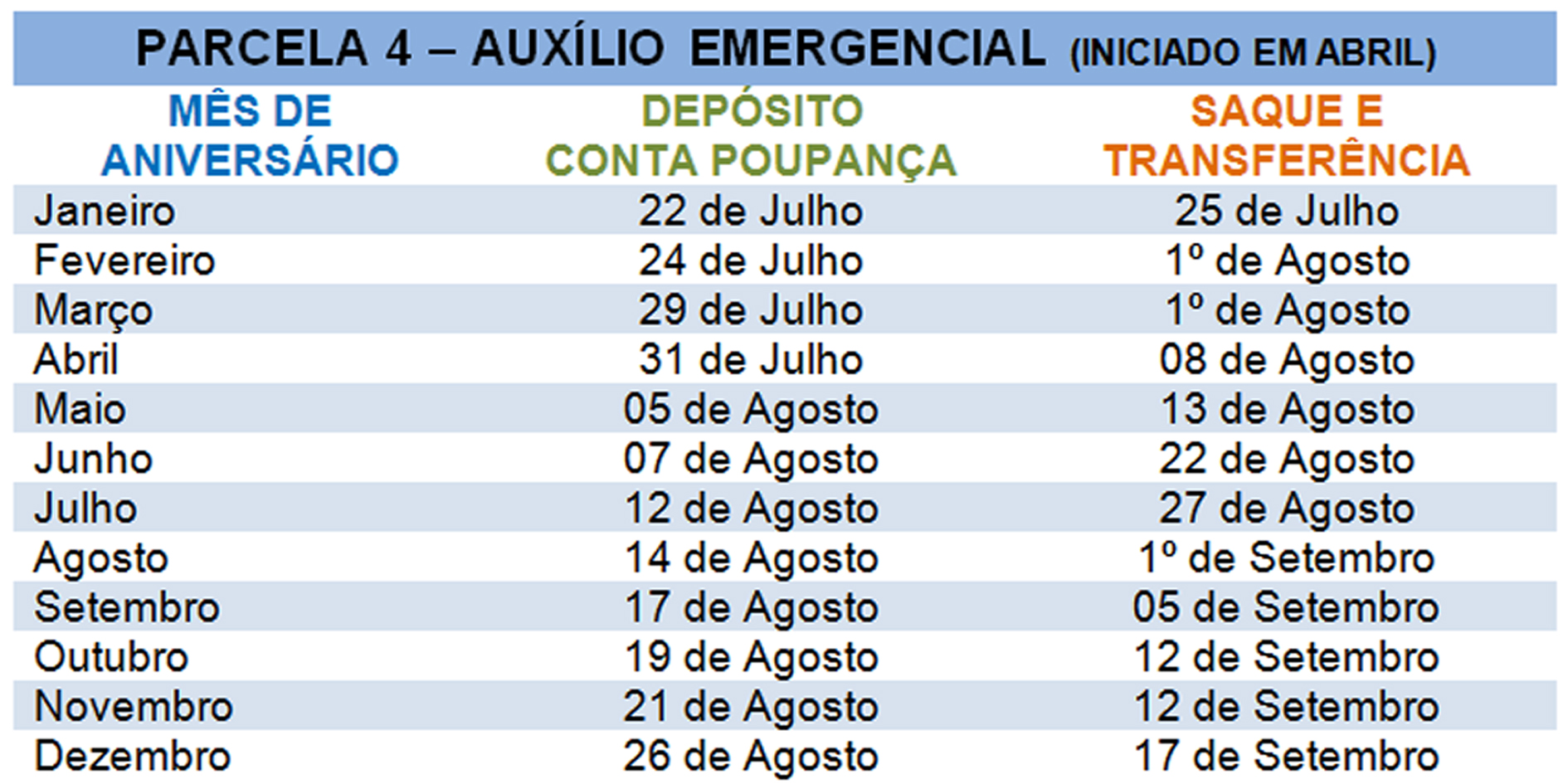 O novo calendário divulgado pela Cidadania através do Diário Oficial da União contempla os pagamentos até a quinta parcela de todos os beneficiários inscritos no programa até 2 de julho, data final para inscrição. Para aqueles que recebem o benefício desde o mês de abril e contabilizam saldo de três parcelas pagas, por exemplo, o valor referente da quarta parcela será depositado em conta poupança social da Caixa Econômica Federal, entre os dias 22 de julho e 26 de agosto, seguindo o mês de aniversário. Para ter direito ao saque em dinheiro, o beneficiário terá que aguardar o prazo entre os dias 25 de julho e 17 de setembro.