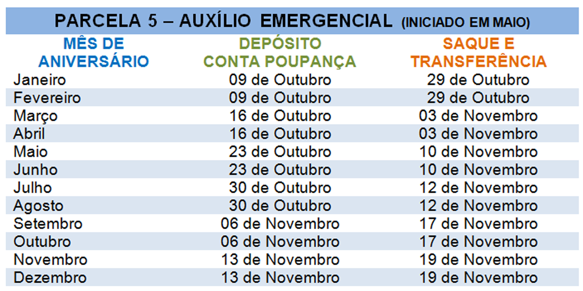 Segundo o cronograma do governo federal, a quinta parcela deste grupo de beneficiários será creditada em conta poupança entre os dias 28 de agosto e 30 de setembro, conforme mês de aniversário do solicitante. O prazo de saque da quinta parcela será entre 19 de setembro e 27 de outubro.