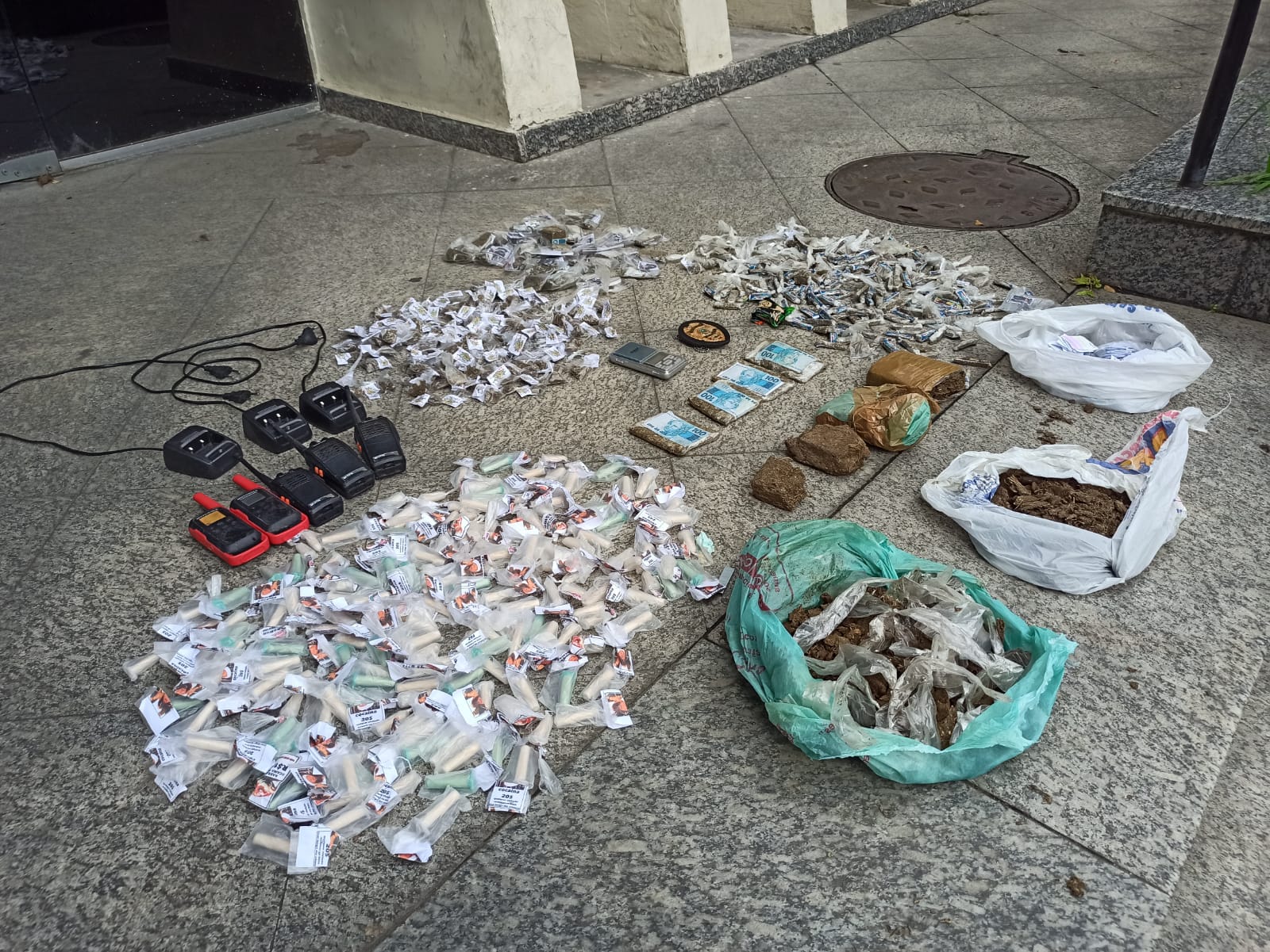 Durante varredura realizada nas proximidades da escola, foram encontrados diversos materiais ilícitos: 3.250 gramas de maconha distribuídas em trouxinhas, porções e tabletes; 175 gramas de cocaína em pinos; cinco rádios comunicadores; três bases de rádio; uma balança de precisão.