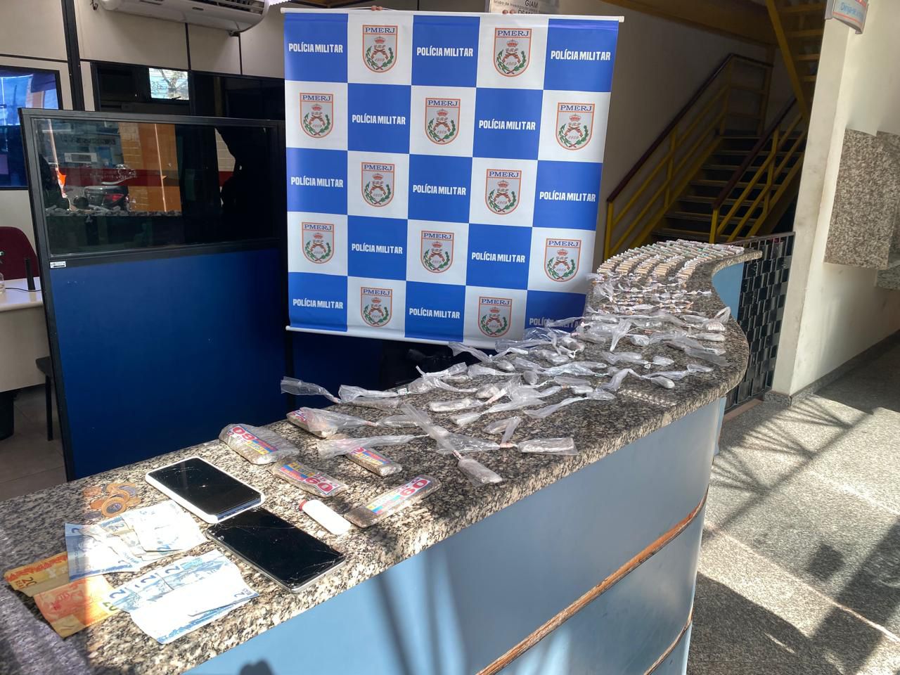 Com eles, foram apreendidas 55 pedras de crack, 43 tiras de maconha, 91 pinos de cocaína, R$ 43,50 em espécie e dois aparelhos celulares. Após perícia realizada na 90ª Delegacia de Polícia (DP), foi confirmado que o material somava 300 gramas de maconha, 184 gramas de cocaína e 14 gramas de crack.