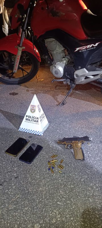 Durante a abordagem, os policiais apreenderam uma pistola calibre 9mm com numeração suprimida e kit rajada, além de um carregador e 13 munições intactas.