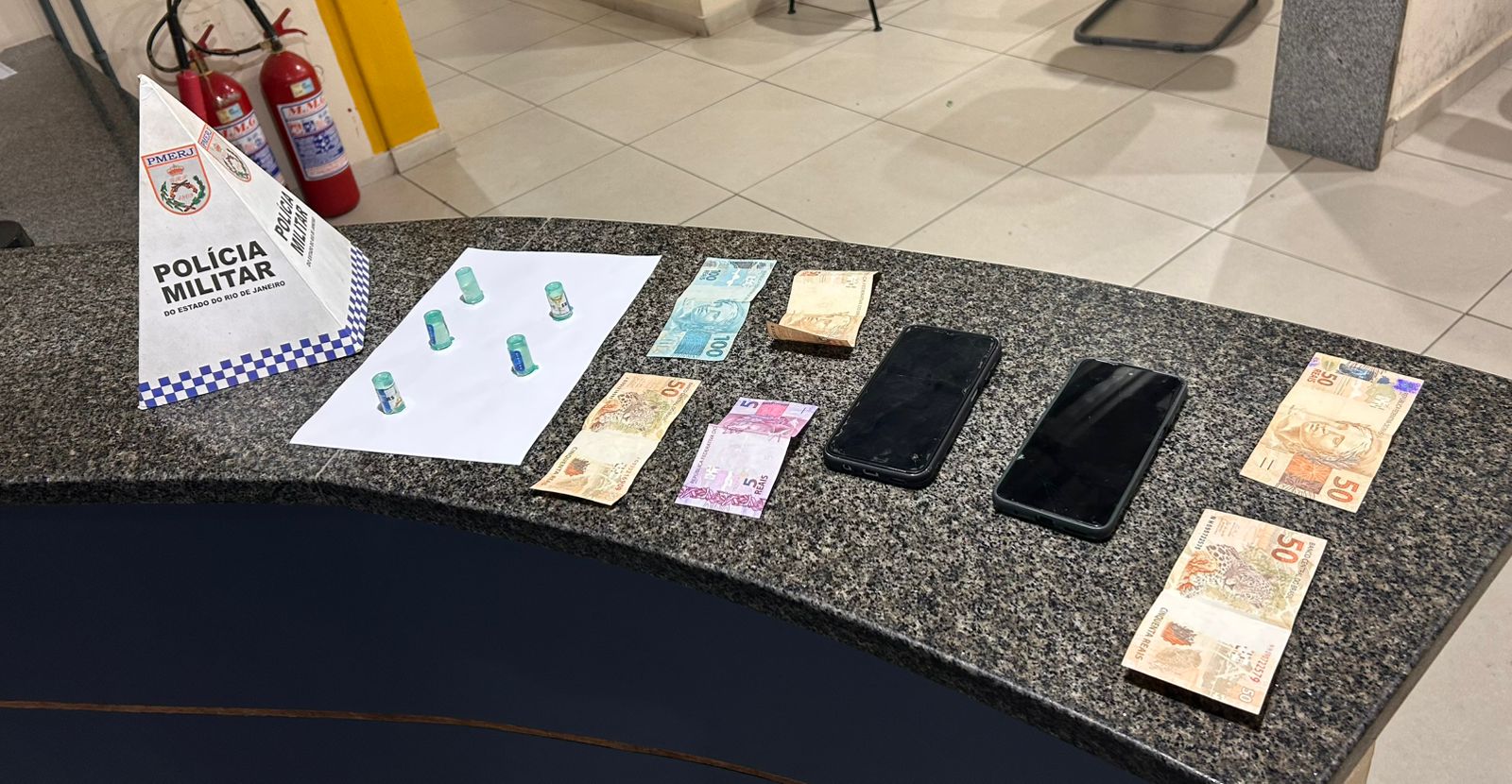 Segundo os policiais, os dois teriam escondido os entorpecentes próximos ao parque infantil da praça. Como já havia histórico de drogas escondidas naquele ponto, os agentes realizaram buscas e encontraram cinco pinos de cocaína escondidos debaixo de uma pedra.