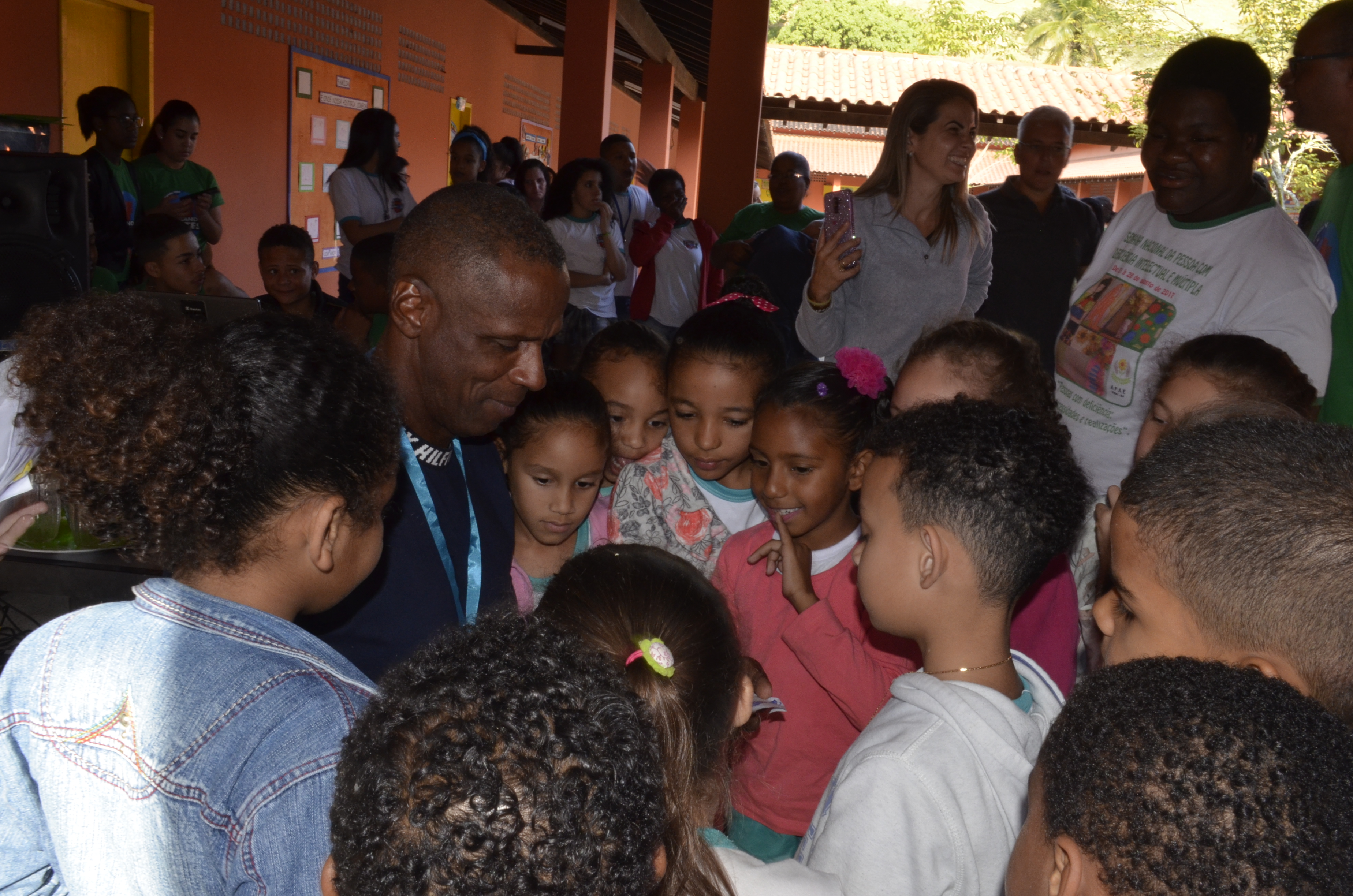 Ex-atleta do atletismo Robson Caetano atendendo alunos em sua participação no projeto – Foto: Divulgação