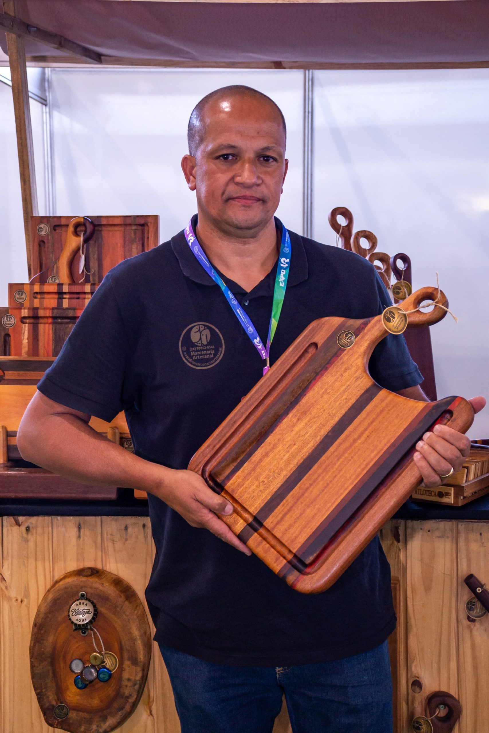 “Comecei com pallets e me apaixonei pelas tábuas de churrasco e me aperfeiçoei. Hoje o artesanato é minha fonte de renda e minha forma de estar bem, mental e fisicamente. Participei da palestra em que o secretário Estadual de Turismo destacou a importância do artesanato como gerador de renda e mobilizador social, e é verdade. É gratificante participar dessa feira, que reconhece o artesanato como uma ferramenta econômica e terapêutica. Eventos como este criam oportunidades e conexões que levamos para a vida toda”, reforça Evandro.