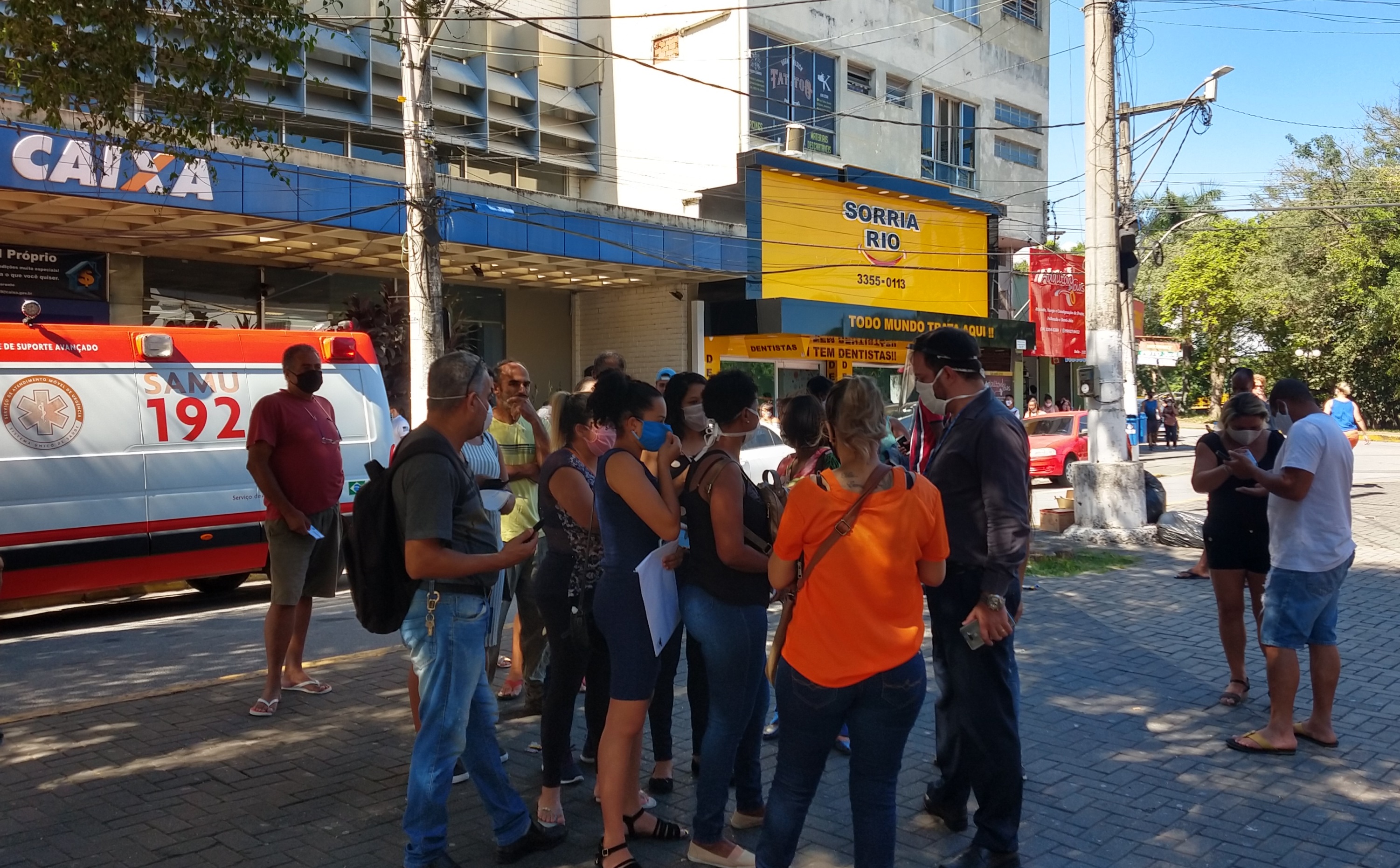 Um funcionário da Caixa Econômica Federal saiu da agência e começou a atender as pessoas no calçadão da Avenida Albino de Almeida. O funcionário, que não pode falar, tentava ajudar as pessoas que aguardava na fila.