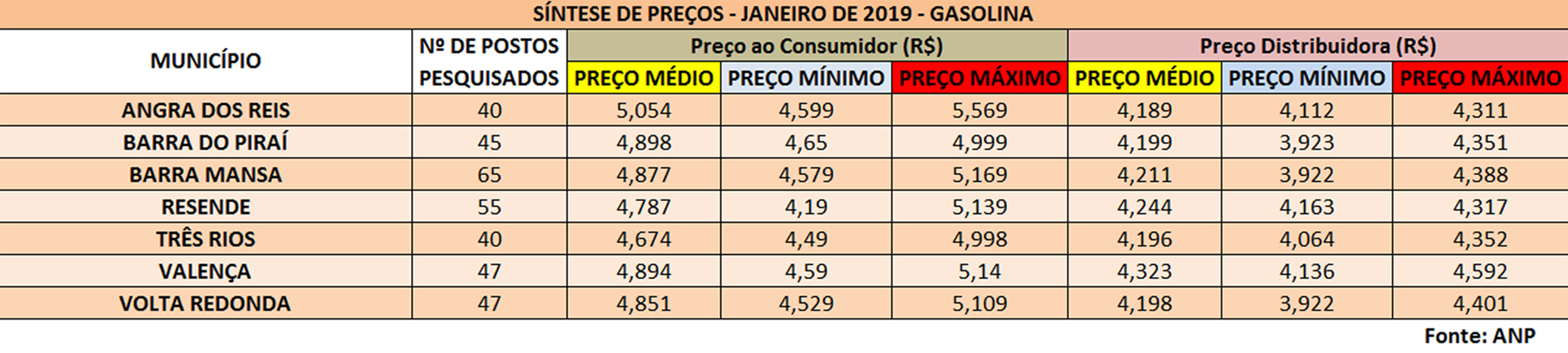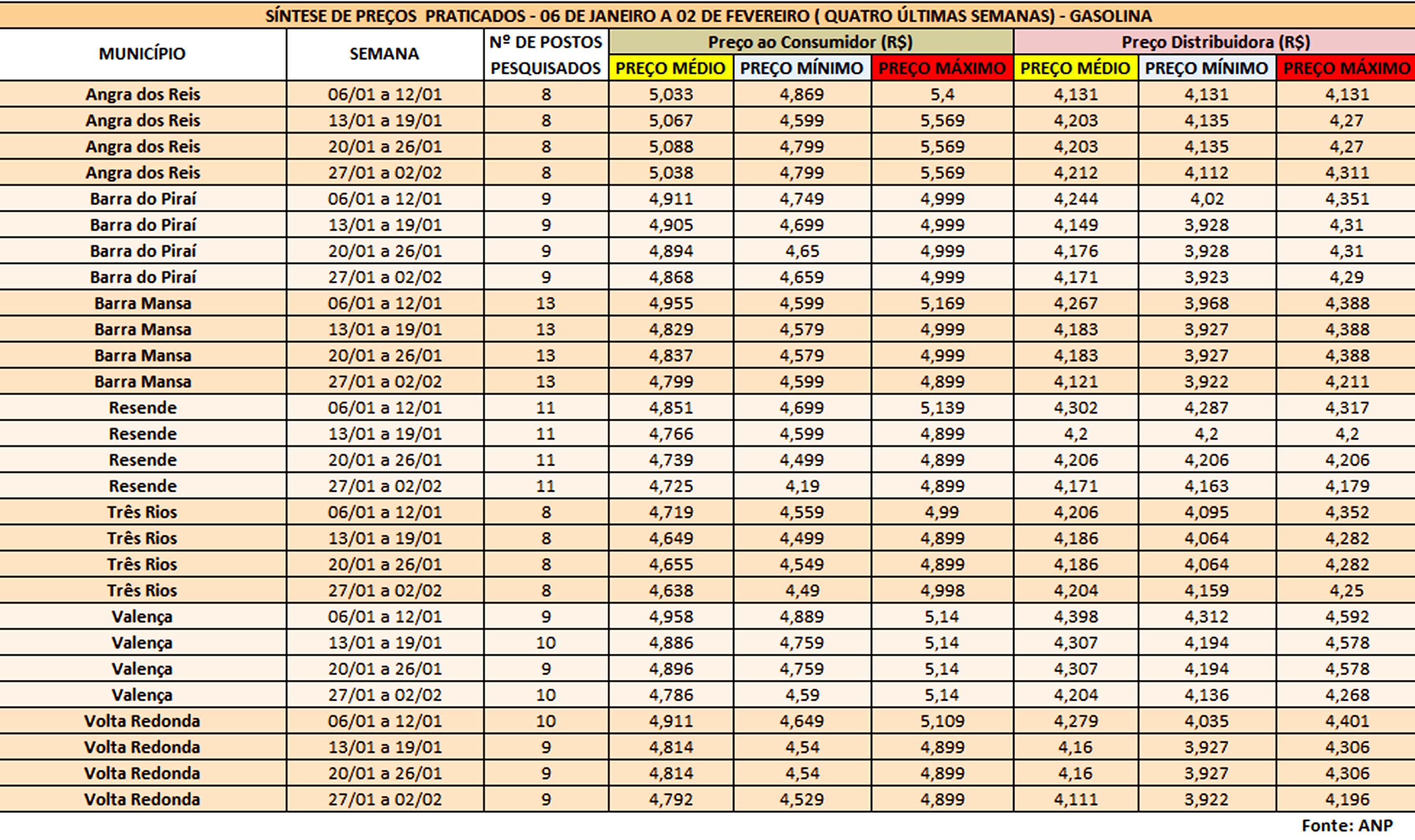 Conforme o levantamento semanal da ANP, o preço médio nos postos das principais cidades do Sul Fluminense baixou na semana do dia 2. Foram pesquisados postos em sete municípios da região e os dados perante a semana anterior, de 20 a 26 de janeiro, mostram queda no preço médio da gasolina: Angra dos Reis (-0,98%), Barra do Piraí (-0,53%), Barra Mansa (-0,79%), Resende (-0,30%), Três Rios (-0,37%), Valença (-2,25%) e Volta Redonda (-0,46%). “Rodo toda a região, é triste pagar gasolina cara na região, principalmente Barra Mansa. Esse sobe e desce só traz prejuízo”, critica o taxista Paulo Gomes.
