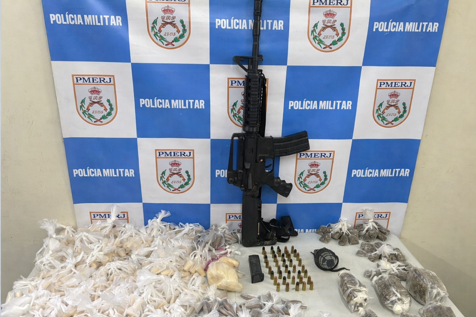 Foram apreendidos uma granada, uma réplica de fuzil, um carregador de pistola calibre 9 milímetros, munições do mesmo calibre e quantidade de drogas ainda em fase de contabilização.