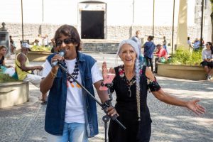 Quarta-feira de sol forte, dia 3 de abril, 14h30min e lá estava a aposentada Goiandeva Nobot Torres, de 81 anos, sentada na Praça da Matriz de São Sebastião acompanhando, encantada, a interpretação de Roberto Carlos feita pelo artista de rua Luciano Brener. Ela, que já trabalhou no Colégio Baldomero Bárbara, contou que Luciano já foi aluno da escola. “Fico feliz de ver ele cantar porque já o conheço há muito tempo. Ele consegue emocionar com essas músicas do Roberto Carlos. São canções que me fazem lembrar da minha mocidade. Isso é bom para a gente esquecer dos problemas da vida”, ressaltou a aposentada.