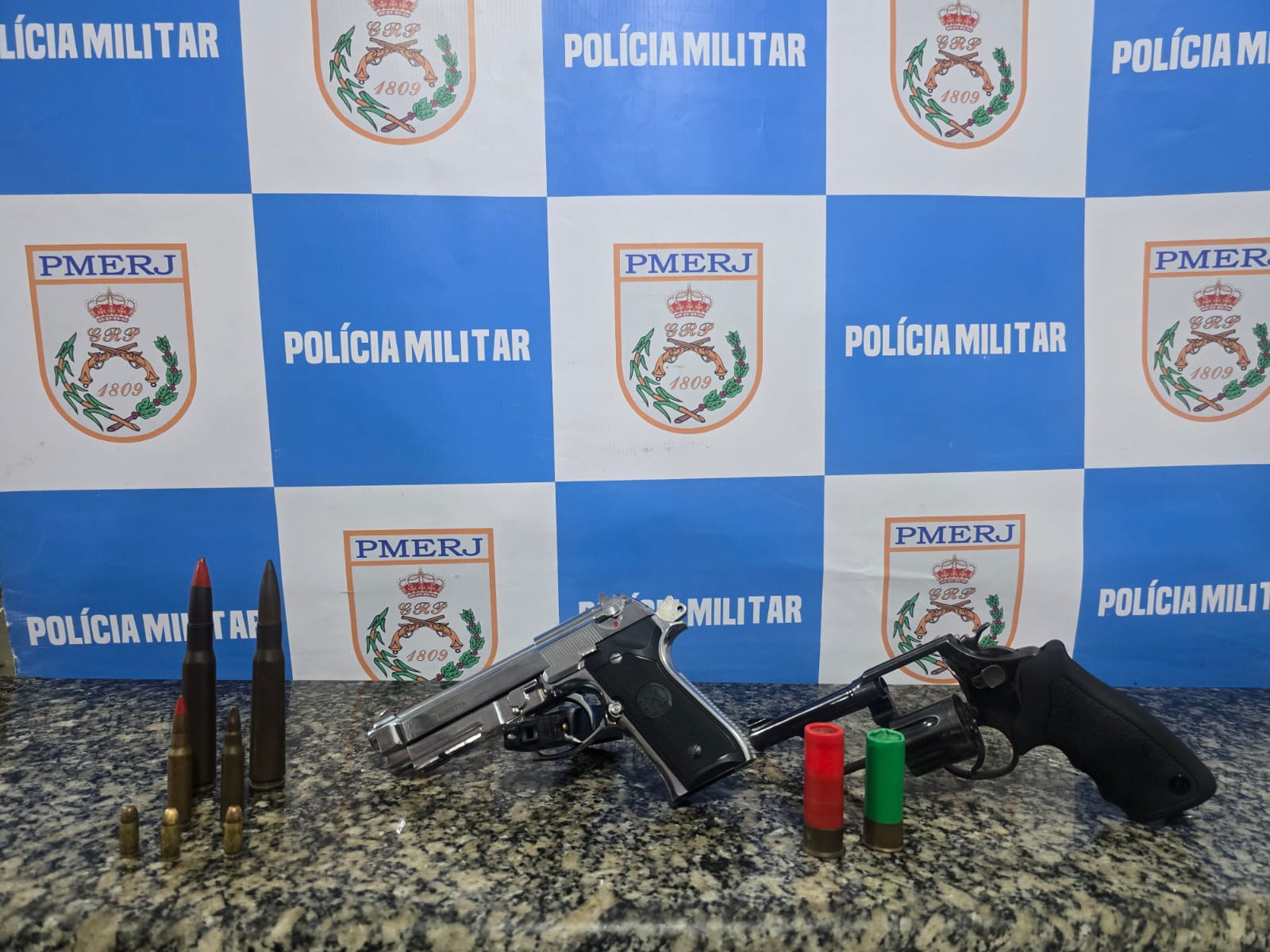 Durante a revista no local, os agentes encontraram um revólver calibre 38, uma pistola de pressão, além de diversas munições de calibres variados, incluindo munições de uso restrito e festim. Todo o material foi apreendido.