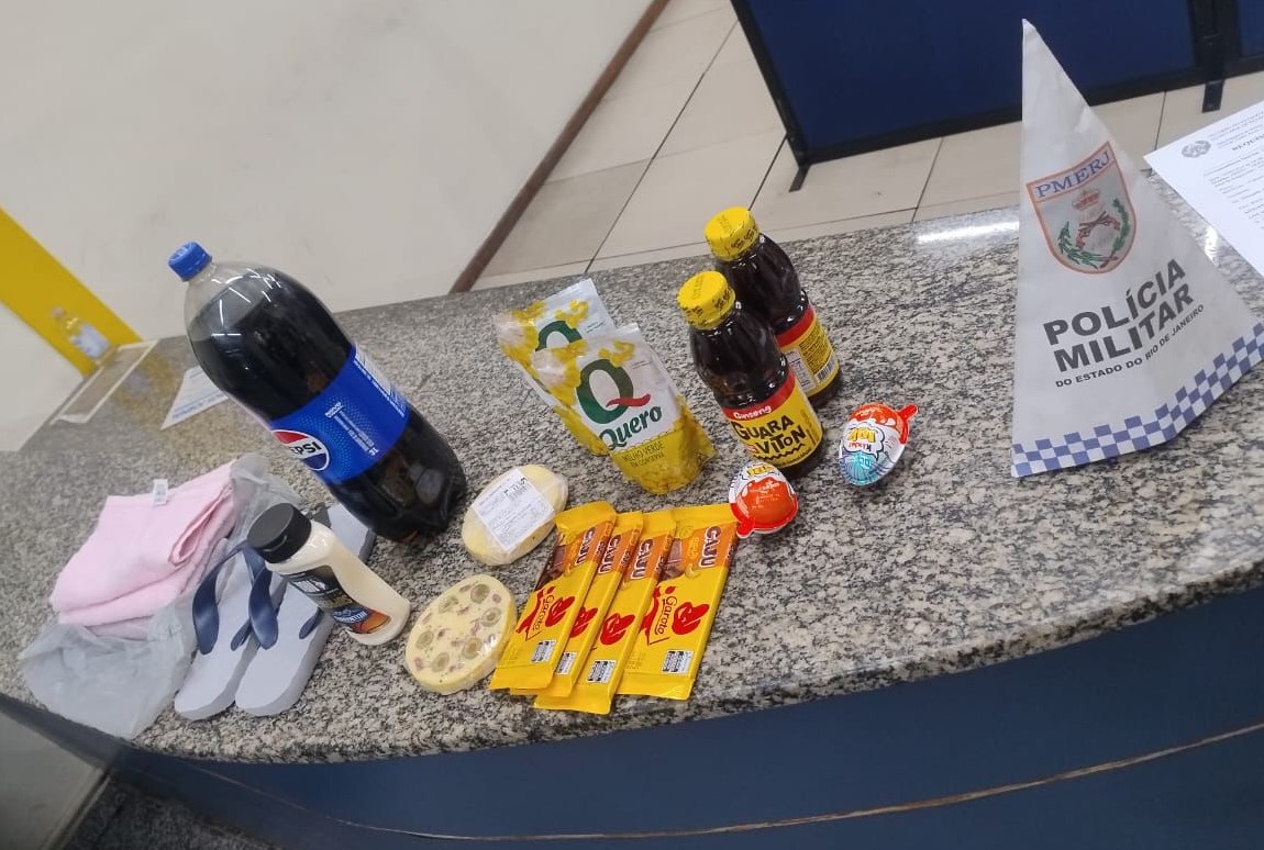 O homem, de 58 anos, foi detido por seguranças do estabelecimento após furtar diversos produtos, entre eles três toalhas de rosto, um par de chinelos Havaianas, um refrigerante, uma maionese, dois queijos, quatro barras de chocolate, duas embalagens de milho verde, duas garrafas de Guaraviton e dois chocolates Kinder Ovo.