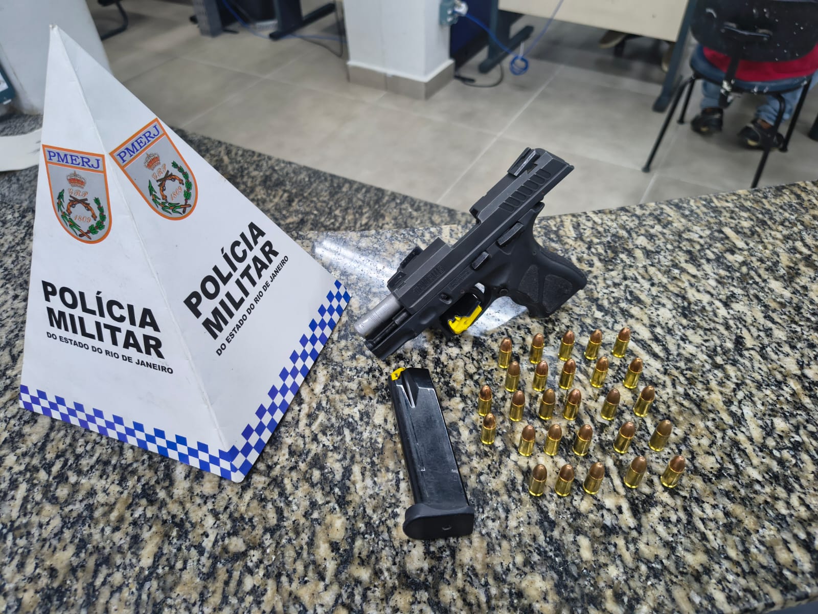 Pistola 9mm com numeração suprimida e 27 munições foram apreendidas durante ação do 37º BPM após denúncia