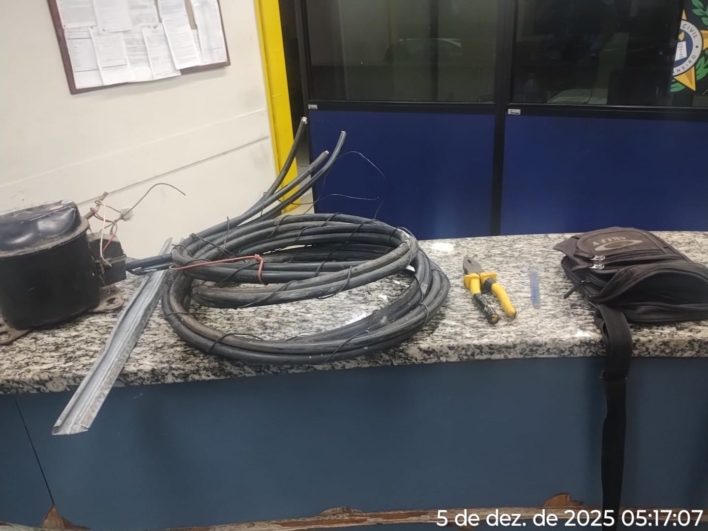 Com ele, os agentes apreenderam um rolo com fios variados, aparentemente recém-cortados, além de um motor que parecia ser de geladeira ou freezer. Dentro de uma bolsa, havia também ferramentas comuns ao corte de cabos: um alicate, uma serrinha e uma chave de fenda. Os policiais localizaram ainda um cachimbo utilizado para consumo de entorpecentes.