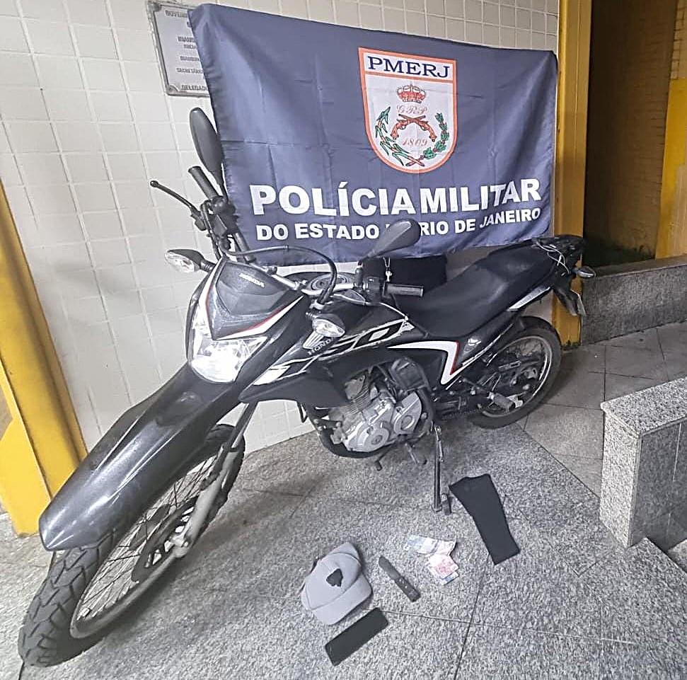 A vítima, uma jovem de 21 anos, relatou aos policiais que havia acabado de sair do trabalho quando foi surpreendida pelo homem, que exigiu sua motocicleta Honda Bros, de cor preta, sob ameaça com uma faca. O suspeito foi localizado e abordado ainda com a arma branca na cintura.