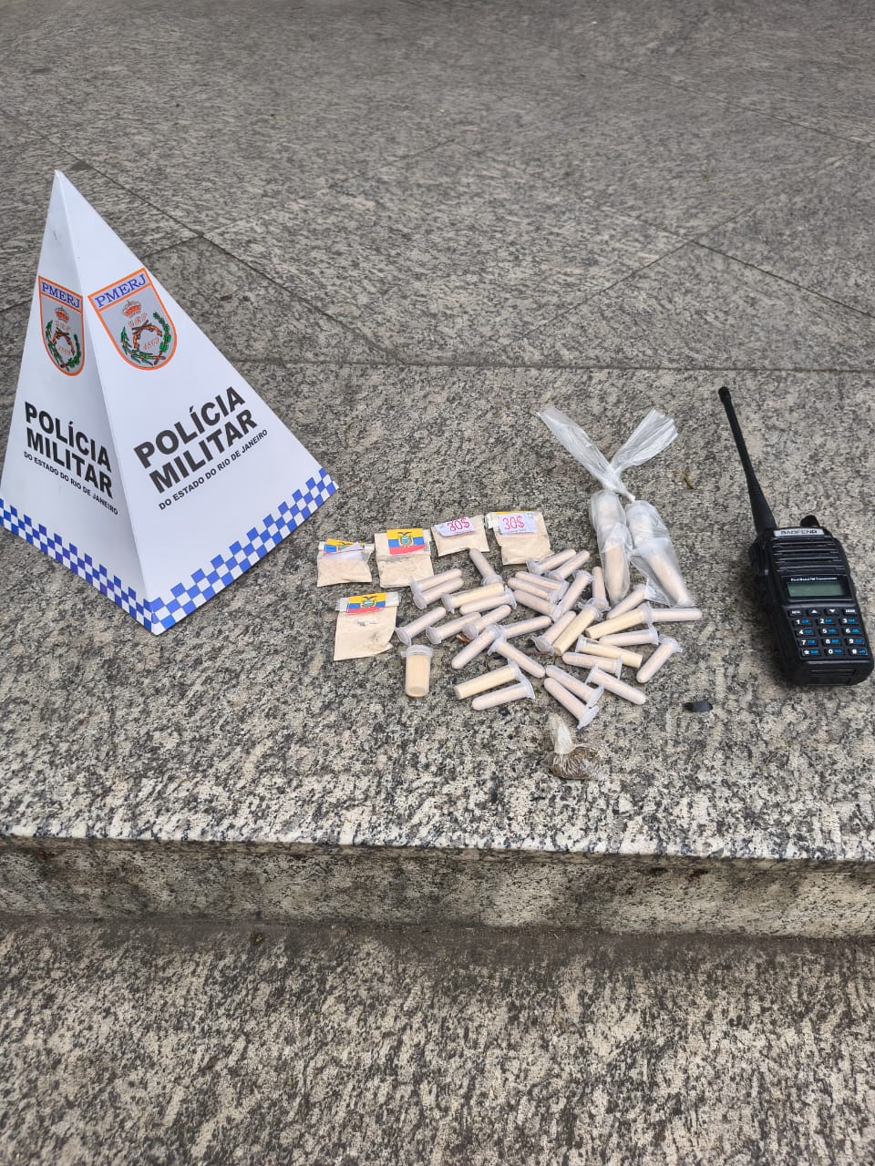 De acordo com a Polícia Militar, os agentes flagraram dois suspeitos com sacolas plásticas. Ao perceberem a chegada da viatura, eles arremessaram as sacolas e tentaram fugir, mas foram alcançados e detidos. Nas sacolas, os policiais encontraram 35 pinos e cinco papelotes de cocaína, além de uma trouxinha de maconha. Em outra área próxima, também foi localizado um rádio transmissor.