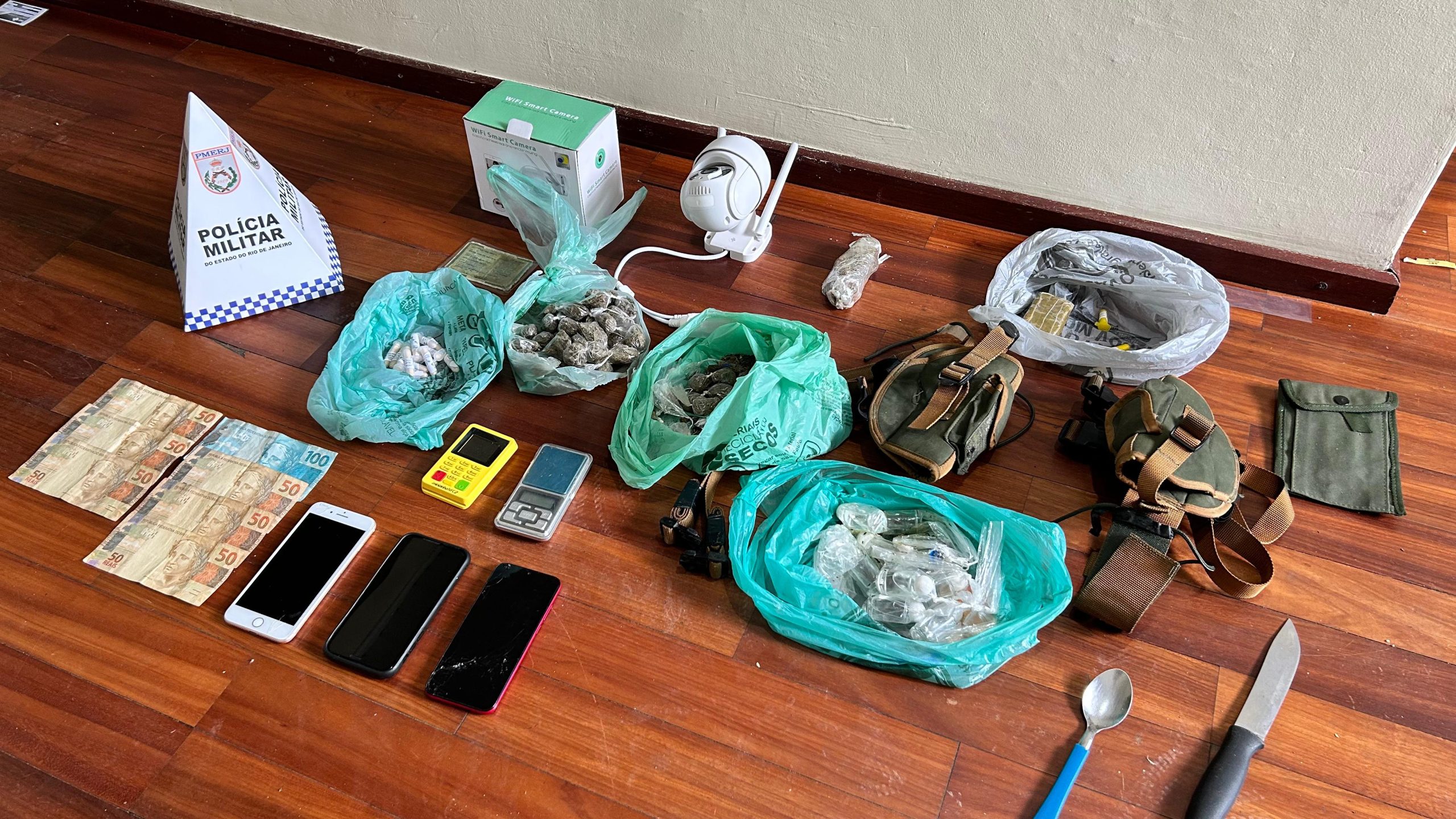 Com o apoio de outras equipes, a Polícia Militar realizou o cerco ao imóvel e conseguiu capturar o suspeito junto com os dois adolescentes. Durante a abordagem e buscas, os policiais encontraram um tablete e 49 invólucros de maconha, um tablete pequeno de haxixe (supermaconha), 12 vidros de cheirinho da “loló”, três celulares, uma balança de precisão, máquina de cartão de crédito, dois coldres de pistola, um porta-carregador de fuzil, uma faca, uma câmera de monitoramento e R$ 405 em espécie.