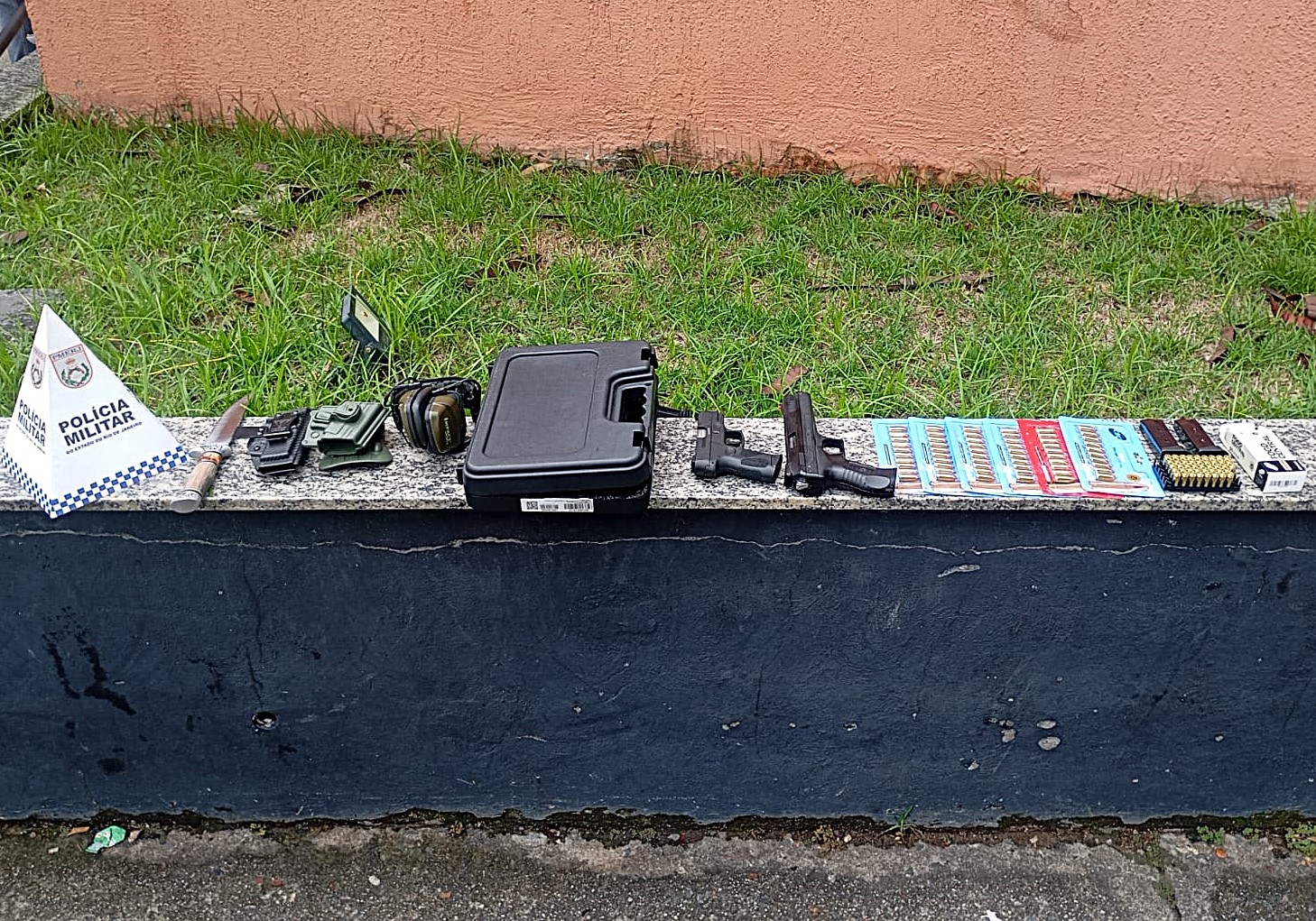 Durante a vistoria da residência, os policiais apreenderam uma pistola G2C, três carregadores da arma, 60 munições avulsas calibre 9mm, seis cartelas com dez munições cada, dois coldres, um abafador, uma faca e uma pistola de pressão Beeman P17. Todo o material foi recolhido e encaminhado à delegacia para registro e perícia.