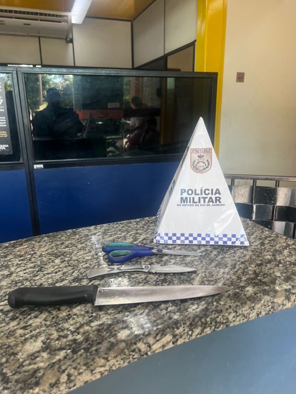 Durante a abordagem, o suspeito foi flagrado com uma faca e um canivete. Ele obedeceu à ordem policial para largar os objetos e foi detido no local.